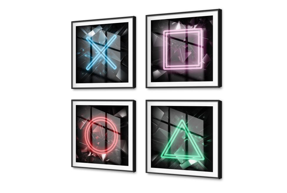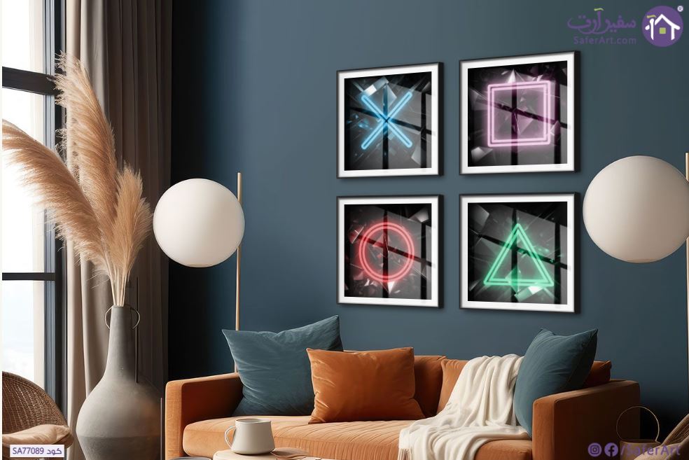 تابلوه مودرن لعلامات البلايستيشن بتصميم ديجيتال باسلوب النيون بالوان زاهيه, متوفر بمقاسات متعددة يمكنك اختيار او تغيير المقاس عند الطلب ,بتصميم مميز لـ تابلوهات مودرن, تابلوهات مودرن , لوحات فنية مودرن جيمنج - العاب و تسليه , التابلوه يغلب عليه الالوان اسود, الوان داكنة, متعدد الالوان , و مصمم بالشكل التالى 4 قطع, متعدد القطع ( اى عدد ) , مربع, اكريليك, ببرواز, برواز SF9, برواز اسود , مناسب لديكور حوائط غرفة شباب, مكاتب – شركات - اعمال , و هو يتميز بالسمات التالية : اشكال هندسية و زخارف, دوائر, مثلثات, مربعات, نيون ستايل , متوفر الان فى مصر و يأتى جاهز للتركيب مع دليل التركيب و اكسسوارات التركيب اللازمه