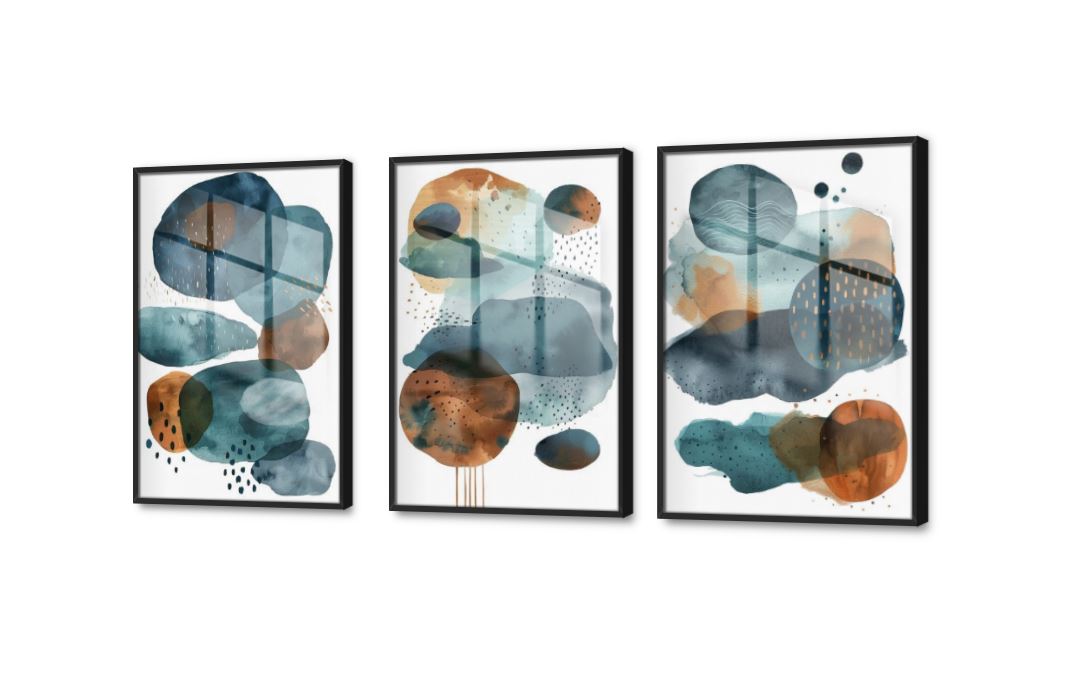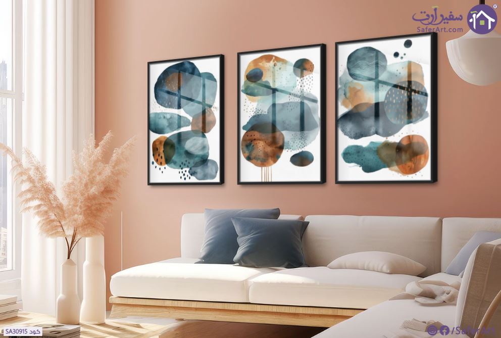 لمحبي الفن التجريدي تابلوهات فنية بقع لونية على شكل دوائر غير منتظمة برسم تجريدي بألوان التركواز والبرتقالي والأزرق والرمادي, متوفر بمقاسات متعددة يمكنك اختيار او تغيير المقاس عند الطلب ,بتصميم مميز لـ تابلوهات مودرن, تابلوهات مودرن , لوحات فنية مودرن اشكال هندسية و زخارف , التابلوه يغلب عليه الالوان اخضر - زيتى, برتقالى , و مصمم بالشكل التالى 3 قطع, متعدد القطع ( اى عدد ) , اكريليك, بالعرض, ببرواز, برواز اسود, مستطيل , مناسب لديكور حوائط غرفة الاستقبال, غرفة المعيشة, مدخل المنزل, مكاتب – شركات - اعمال , و هو يتميز بالسمات التالية : اشكال هندسية و زخارف, الوان مائية, بوهو ستايل, مودرن , متوفر الان فى مصر و يأتى جاهز للتركيب مع دليل التركيب و اكسسوارات التركيب اللازمه