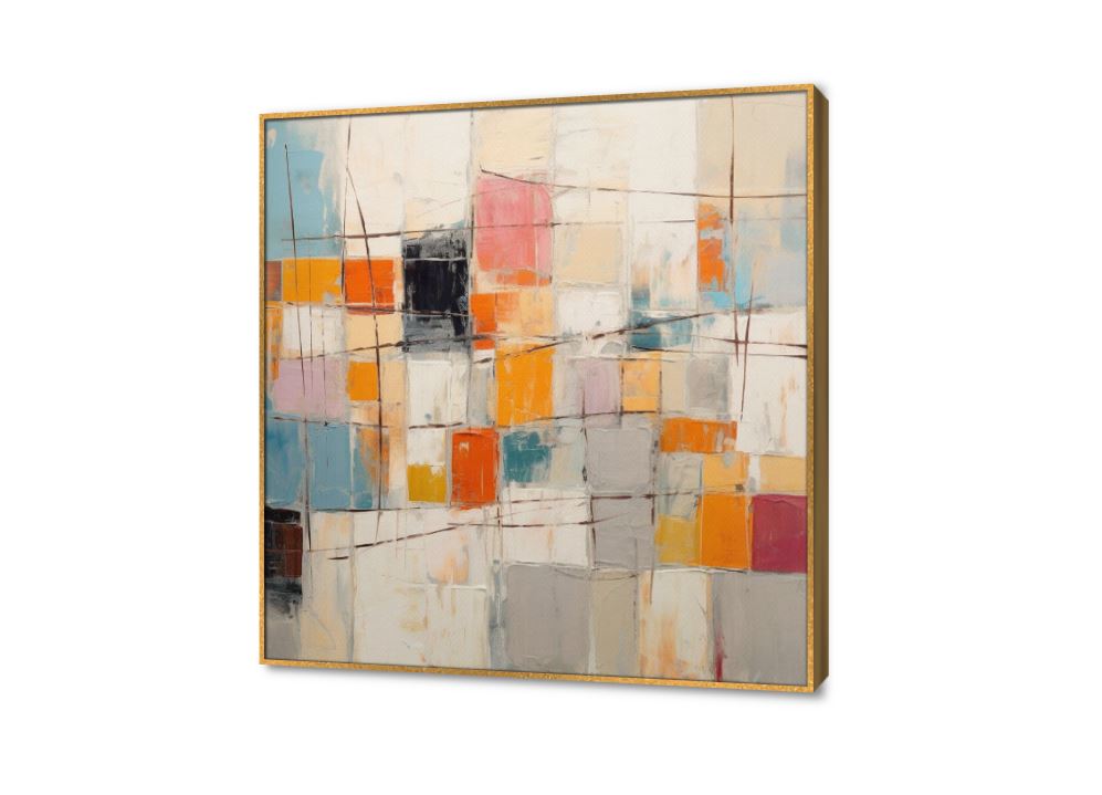 لوحة فنية رسومات لأشكال هندسية؛ مربعات متداخلة  بألوان متعددة يغلب عليها اللون البرتقالي برسم تجريدي مودرن, متوفر بمقاسات متعددة يمكنك اختيار او تغيير المقاس عند الطلب ,بتصميم مميز لـ تابلوهات مودرن, تابلوهات مودرن , لوحات فنية مودرن تجريدي , التابلوه يغلب عليه الالوان متعدد الالوان , و مصمم بالشكل التالى 1 قطعه , ببرواز, برواز ذهبى, مربع , مناسب لديكور حوائط غرفة الاستقبال, غرفة المعيشة, مدخل المنزل, مكاتب – شركات - اعمال , و هو يتميز بالسمات التالية : الوان زيتية - اكريليك, لوحات فنية, مودرن , متوفر الان فى مصر و يأتى جاهز للتركيب مع دليل التركيب و اكسسوارات التركيب اللازمه
