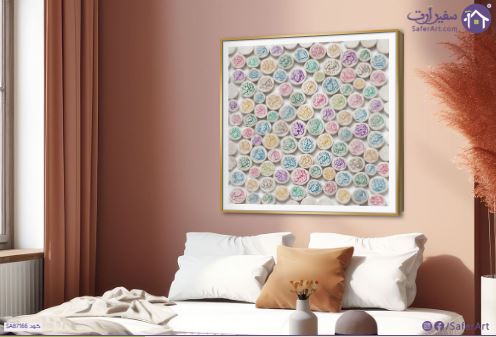 لوحات فنية اسماء الله الحسنى بالوان زاهية لمجموعه من الاحجار البيضاء مكتوب عليها اسماء الله الحسنى بالوان زاهية, متوفر بمقاسات متعددة يمكنك اختيار او تغيير المقاس عند الطلب ,بتصميم مميز لـ تابلوهات مودرن, تابلوهات مودرن , لوحات فنية مودرن اسماء الله الحسنى, اسلامى - ايات قرآنية و خط عربى , التابلوه يغلب عليه الالوان اصفر, بينك – فوشيا, درجات الباستيل, متعدد الالوان, موف – ارجوانى , و مصمم بالشكل التالى 1 قطعه , ببرواز, برواز SF9, برواز ذهبى, مربع , مناسب لديكور حوائط غرفة الاستقبال, غرفة المعيشة, مدخل المنزل, مكاتب – شركات - اعمال , و هو يتميز بالسمات التالية : اشكال هندسية و زخارف, دوائر, ديجيتال آرت, كتابات و حروف, مودرن , متوفر الان فى مصر و يأتى جاهز للتركيب مع دليل التركيب و اكسسوارات التركيب اللازمه