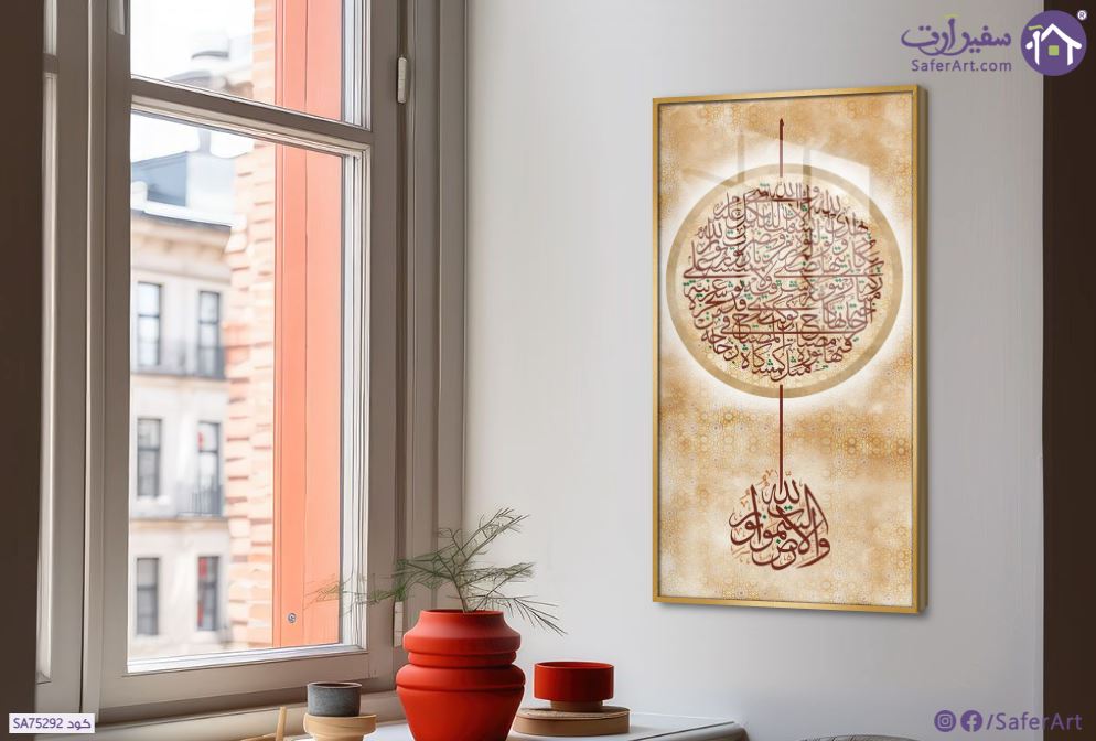 تابلوه مودرن مكتوب عليه بخط الثلث ( اللَّهُ نُورُ السَّمَوَاتِ وَالأرْضِ ) على خلفية من درجات البيج بزخارف اسلاميه دقيقة و الكتابه باللون الاحمر الداكن, متوفر بمقاسات متعددة يمكنك اختيار او تغيير المقاس عند الطلب ,بتصميم مميز لـ تابلوهات مودرن, تابلوهات مودرن , لوحات فنية مودرن ايات قرآنية و خط عربى, اسلامى - ايات قرآنية و خط عربى , التابلوه يغلب عليه الالوان احمر - نبيتى, بنى - بيج , و مصمم بالشكل التالى 1 قطعه , بالطول, اكريليك, ببرواز, برواز ذهبى, مستطيل , مناسب لديكور حوائط غرفة الاستقبال, غرفة المعيشة, مدخل المنزل, مكاتب – شركات - اعمال , و هو يتميز بالسمات التالية : تماثل - سيميترى, ديجيتال آرت, قابل للتعديل, كتابات و حروف, مودرن , متوفر الان فى مصر و يأتى جاهز للتركيب مع دليل التركيب و اكسسوارات التركيب اللازمه