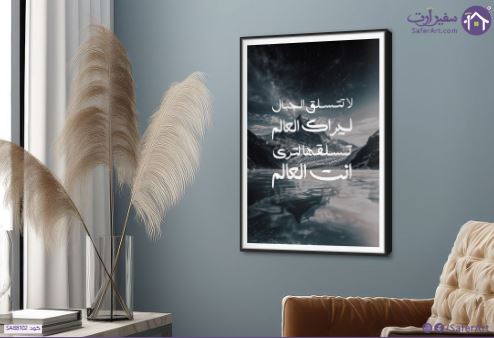 تابلوه مودرن يجمع بين مشهد طبيعي خلاب و عباره ملهمة, يظهر فى الخلفيه جبال شاهقة تنعكس صورتها على بحيره, مع سماء مليئه بالنجوم, الكتابه باللون الابيض تتوسط التابلوه "لا تتسلق الجبال ليراك العالم، تسلقها لترى أنت العالم" التابلوه يوحي بالتأمل والتحفيز الذاتي، ويدعو إلى استكشاف الذات والعالم من منظور شخصي, متوفر بمقاسات متعددة يمكنك اختيار او تغيير المقاس عند الطلب ,بتصميم مميز لـ تابلوهات مودرن, تابلوهات مودرن , لوحات فنية مودرن اسلامى - ايات قرآنية و خط عربى, جبال, حكم - كلمات عربية, مناظر طبيعية , التابلوه يغلب عليه الالوان ابيض - اوف وايت, ابيض و اسود, ازرق - تركواز, الوان داكنة , و مصمم بالشكل التالى 1 قطعه , بالطول, ببرواز, برواز SF9, برواز اسود, مستطيل , مناسب لديكور حوائط غرفة المعيشة, مدخل المنزل, مكاتب – شركات - اعمال , و هو يتميز بالسمات التالية : ديجيتال آرت, قابل للتعديل, كتابات و حروف, لوحات فنية, مودرن , متوفر الان فى مصر و يأتى جاهز للتركيب مع دليل التركيب و اكسسوارات التركيب اللازمه
