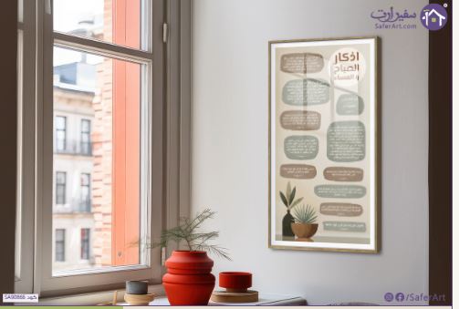 تابلوهات ديكور اذكار الصباح و المساء، بالوان هادئه طبيعية و خط عربى واضح مع رسومات بسيطه لفازات و صبار اسفل التصميم, متوفر بمقاسات متعددة يمكنك اختيار او تغيير المقاس عند الطلب ,بتصميم مميز لـ تابلوهات مودرن, تابلوهات مودرن , لوحات فنية مودرن اذكار و ادعية, اسلامى - ايات قرآنية و خط عربى , التابلوه يغلب عليه الالوان اخضر - زيتى, بنى - بيج , و مصمم بالشكل التالى 1 قطعه , اكريليك, بالطول, ببرواز, برواز SF9, برواز خشبى, مستطيل , مناسب لديكور حوائط غرفة المعيشة, غرفة النوم, غرفة بنات, مدخل المنزل , و هو يتميز بالسمات التالية : بسيط و هادئ, بوهو ستايل, ديجيتال آرت, قابل للتعديل, كتابات و حروف, لوحات فنية, مودرن , متوفر الان فى مصر و يأتى جاهز للتركيب مع دليل التركيب و اكسسوارات التركيب اللازمه