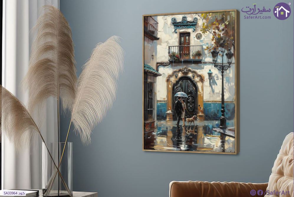 لوحة فنية لرجل وإمرأة في إحدى الشوراع القديمة ذات الطابع الكلاسيكي والمباني الكلاسيكية يحملان مظلة في أجواء ممطرة رومانسية .., متوفر بمقاسات متعددة يمكنك اختيار او تغيير المقاس عند الطلب ,بتصميم مميز لـ تابلوهات مودرن, تابلوهات مودرن , لوحات فنية مودرن رومانسى - ثنائى, رومانسى, شخصيات و وجوه , التابلوه يغلب عليه الالوان ازرق - تركواز, ابيض - اوف وايت, بنى - بيج , و مصمم بالشكل التالى 1 قطعه , بالطول, ببرواز, برواز خشبى, مستطيل , مناسب لديكور حوائط غرفة الاستقبال, غرفة النوم , و هو يتميز بالسمات التالية : الوان زيتية - اكريليك, عتيق - فينتاج, كلاسيك – نيو كلاسيك, لوحات فنية , متوفر الان فى مصر و يأتى جاهز للتركيب مع دليل التركيب و اكسسوارات التركيب اللازمه