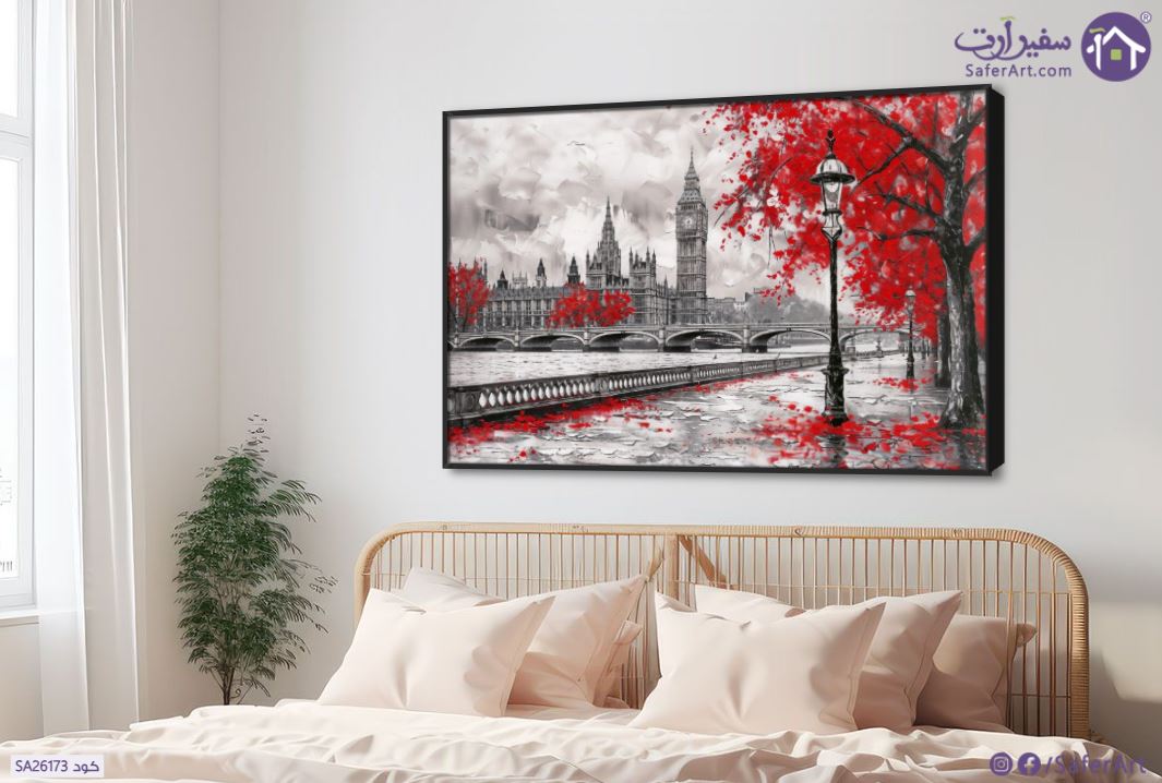 تابلوه مودرن لشوارع لندن وفي الخلفية ساعة بيج بين وبعض الأشجار باللون الأحمر في اجواء خريفية تعكس جمال الطبيعة, متوفر بمقاسات متعددة يمكنك اختيار او تغيير المقاس عند الطلب ,بتصميم مميز لـ تابلوهات مودرن, تابلوهات مودرن , لوحات فنية مودرن دول و مدن مشهورة, اماكن و مدن و مباني , التابلوه يغلب عليه الالوان احمر - نبيتى, اللون الواحد, رمادى , و مصمم بالشكل التالى 1 قطعه , بالعرض, ببرواز, برواز اسود, مستطيل , مناسب لديكور حوائط غرفة الاستقبال, غرفة المعيشة, غرفة النوم , و هو يتميز بالسمات التالية : الوان زيتية - اكريليك, كلاسيك – نيو كلاسيك, لوحات فنية , متوفر الان فى مصر و يأتى جاهز للتركيب مع دليل التركيب و اكسسوارات التركيب اللازمه