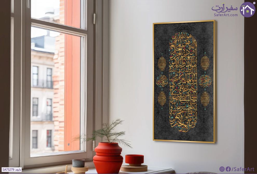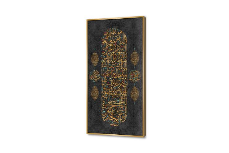 تابلوهات مودرن بخلفيه باللون الاسود و كتابه بخط الثلث بدرجات الذهبى و بعض الزخارف الاسلامية على الجانبين كتب عليه ( هو الله الذي لا إله إلا هو عالم الغيب والشهادة ), متوفر بمقاسات متعددة يمكنك اختيار او تغيير المقاس عند الطلب ,بتصميم مميز لـ تابلوهات مودرن, تابلوهات مودرن , لوحات فنية مودرن ايات قرآنية و خط عربى, اسلامى - ايات قرآنية و خط عربى , التابلوه يغلب عليه الالوان اسود, الوان داكنة, فضى – ذهبى , و مصمم بالشكل التالى 1 قطعه , بالطول, ببرواز, برواز ذهبى, مستطيل , مناسب لديكور حوائط مدخل المنزل, غرفة الاستقبال, غرفة المعيشة, مكاتب – شركات - اعمال , و هو يتميز بالسمات التالية : تماثل - سيميترى, ديجيتال آرت, قابل للتعديل, كتابات و حروف, مودرن , متوفر الان فى مصر و يأتى جاهز للتركيب مع دليل التركيب و اكسسوارات التركيب اللازمه