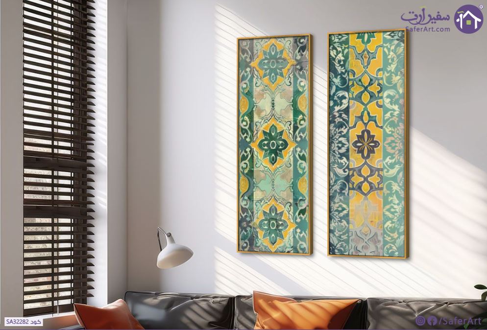 لوحات ديكورات لنقوش وزخارف باللون الأزرق مع رتوش باللون الأصفر تابلوه من قطعتين بتصميم مودرن مميز, متوفر بمقاسات متعددة يمكنك اختيار او تغيير المقاس عند الطلب ,بتصميم مميز لـ تابلوهات مودرن, تابلوهات مودرن , لوحات فنية مودرن اسلامى - ايات قرآنية و خط عربى, زخارف اسلامية , التابلوه يغلب عليه الالوان اخضر - زيتى, اصفر , و مصمم بالشكل التالى 2 قطعه, متعدد القطع ( اى عدد ) , بالطول, ببرواز, برواز ذهبى, مستطيل , مناسب لديكور حوائط غرفة الاستقبال, غرفة المعيشة, مدخل المنزل, مكاتب – شركات - اعمال , و هو يتميز بالسمات التالية : اشكال هندسية و زخارف, تماثل - سيميترى, ديجيتال آرت, لوحات فنية , متوفر الان فى مصر و يأتى جاهز للتركيب مع دليل التركيب و اكسسوارات التركيب اللازمه