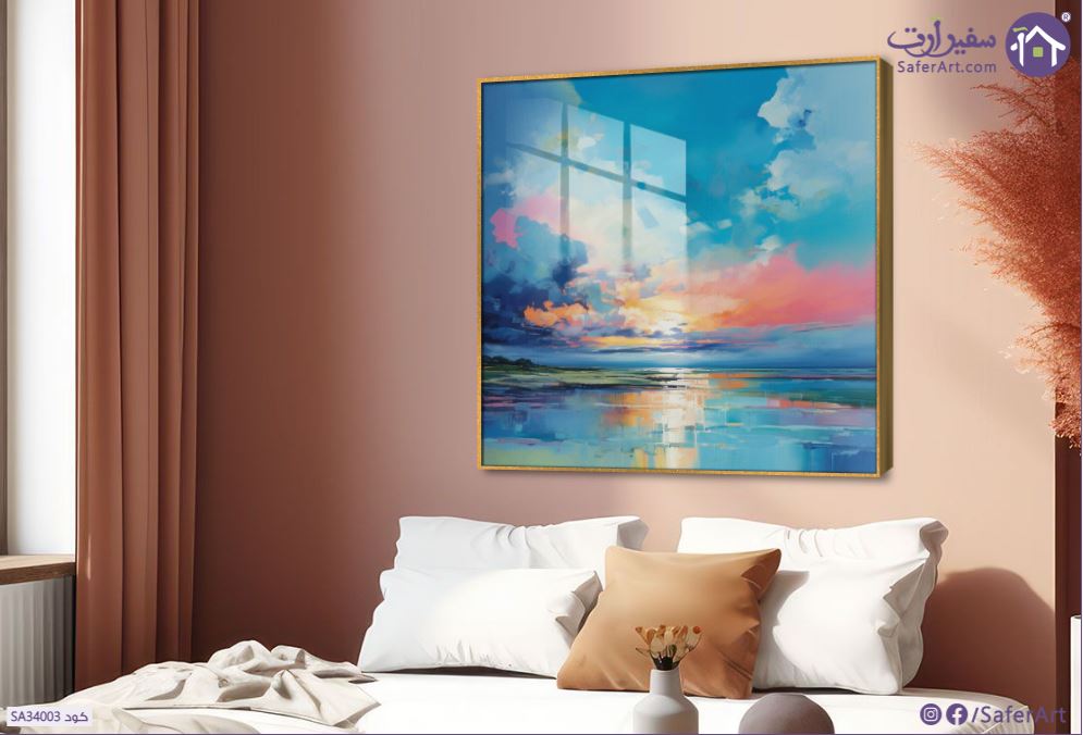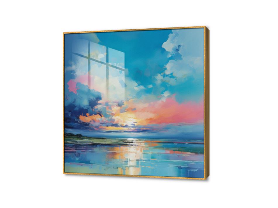 لوحة فنية  للسماء الزرقاء وانعكاس ألوانها على زرقة مياه البحر مع مزيج من اللون البينك والأصفر برسم تجريدي مودرن.., متوفر بمقاسات متعددة يمكنك اختيار او تغيير المقاس عند الطلب ,بتصميم مميز لـ تابلوهات مودرن, تابلوهات مودرن , لوحات فنية مودرن سحاب, مناظر طبيعية , التابلوه يغلب عليه الالوان ازرق - تركواز, برتقالى, بينك – فوشيا , و مصمم بالشكل التالى 1 قطعه , اكريليك, ببرواز, برواز ذهبى, مربع , مناسب لديكور حوائط غرفة المعيشة, مدخل المنزل, مكاتب – شركات - اعمال , و هو يتميز بالسمات التالية : الوان مائية, لوحات فنية, مودرن , متوفر الان فى مصر و يأتى جاهز للتركيب مع دليل التركيب و اكسسوارات التركيب اللازمه