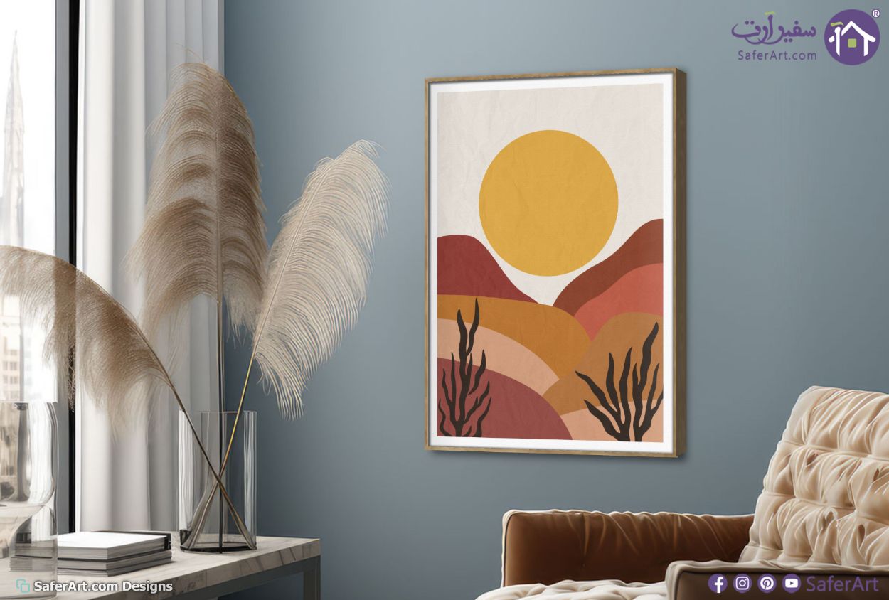 يتميز هذا التصميم بكونه تابلوه مودرن يجسد مشهدا طبيعيا تجريديا يجمع بين بساطة الخطوط وجمال الالوان الترابية الدافئة مع قرص شمس اصفر يتوسط السماء فوق تلال متدرجة ونباتات صحراوية برية مما يعكس اسلوب الفن البوهيمي الحديث الذي يضفي لمسة من الهدوء والرقي على اي مساحة داخلية بفضل توازن عناصره الفنية وجاذبيتها البصرية المعاصرة., متوفر بمقاسات متعددة يمكنك اختيار او تغيير المقاس عند الطلب ,بتصميم مميز لـ تابلوهات مودرن, تابلوهات مودرن , لوحات فنية مودرن اوراق شجر - نباتات, جبال, صحراء, اشكال هندسية و زخارف, تجريدي, مناظر طبيعية, ورود - زهور - نباتات , التابلوه يغلب عليه الالوان ابيض - اوف وايت, اسود, اصفر, بنى - بيج, درجات الباستيل , و مصمم بالشكل التالى 1 قطعه , بالطول, ببرواز, برواز خشبى, مستطيل , مناسب لديكور حوائط غرفة الاستقبال, غرفة المعيشة, غرفة النوم, مدخل المنزل, مكاتب – شركات - اعمال , و هو يتميز بالسمات التالية : بسيط و هادئ, بوهو ستايل, ديجيتال آرت, لوحات فنية, مظهر بارز, مودرن , متوفر الان فى مصر و يأتى جاهز للتركيب مع دليل التركيب و اكسسوارات التركيب اللازمه