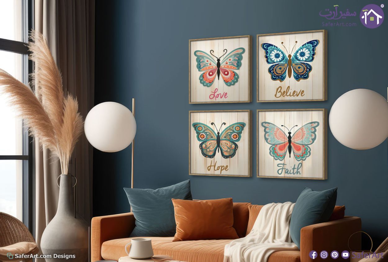 تابلوهات فراشات مودرن مختاره بعنايه لمجموعه من الفراشات الملونه بالوانه جذابه وزاهيه باللون الازرق ودرجاته واللون البينك على خلفيه باللون البيج, متوفر بمقاسات متعددة يمكنك اختيار او تغيير المقاس عند الطلب ,بتصميم مميز لـ تابلوهات مودرن, تابلوهات مودرن , لوحات فنية مودرن فراشات, حيوانات و طيور , التابلوه يغلب عليه الالوان ازرق - تركواز, بنى - بيج, بينك – فوشيا , و مصمم بالشكل التالى 4 قطع, متعدد القطع ( اى عدد ) , ببرواز, برواز خشبى, مربع , مناسب لديكور حوائط غرفة الاستقبال, غرفة المعيشة , و هو يتميز بالسمات التالية : تماثل - سيميترى, ديجيتال آرت, لوحات فنية , متوفر الان فى مصر و يأتى جاهز للتركيب مع دليل التركيب و اكسسوارات التركيب اللازمه
