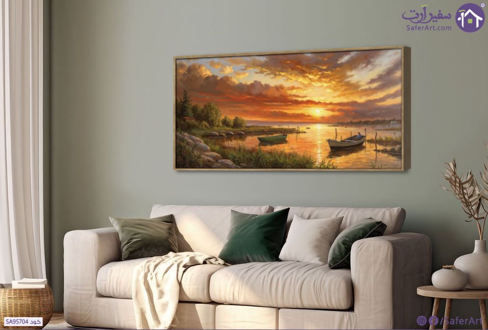 تابلوه مودرن يجسد جمال الطبيعة الساحر في مشهد غروب الشمس الخلاب حيث تتناغم الألوان البرتقالية والصفراء الدافئة في السماء المليئة بالغيوم مع انعكاسها الهادئ على صفحة الماء و القوارب الراسية في سكون مما يخلق إحساسا عميقا بالهدوء والسكينة بلمسات فنية انطباعية رائعة تبرز روعة تفاصيل الضوء والظل وتجعلها قطعة ديكور مثالية تضيف الجمال الطبيعي لمنزلك., متوفر بمقاسات متعددة يمكنك اختيار او تغيير المقاس عند الطلب ,بتصميم مميز لـ تابلوهات مودرن, تابلوهات مودرن , لوحات فنية مودرن اشجار, بحار و شواطئ و مراكب, سحاب, شاطئ البحر, قوارب و مراكب, مناظر طبيعية , التابلوه يغلب عليه الالوان اخضر - زيتى, برتقالى, بنى - بيج, متعدد الالوان , و مصمم بالشكل التالى 1 قطعه , بالعرض, ببرواز, برواز خشبى, مستطيل , مناسب لديكور حوائط غرفة الاستقبال, غرفة المعيشة, غرفة النوم, مدخل المنزل, مكاتب – شركات - اعمال , و هو يتميز بالسمات التالية : الوان زيتية - اكريليك, كلاسيك – نيو كلاسيك, لوحات فنية, مودرن , متوفر الان فى مصر و يأتى جاهز للتركيب مع دليل التركيب و اكسسوارات التركيب اللازمه
