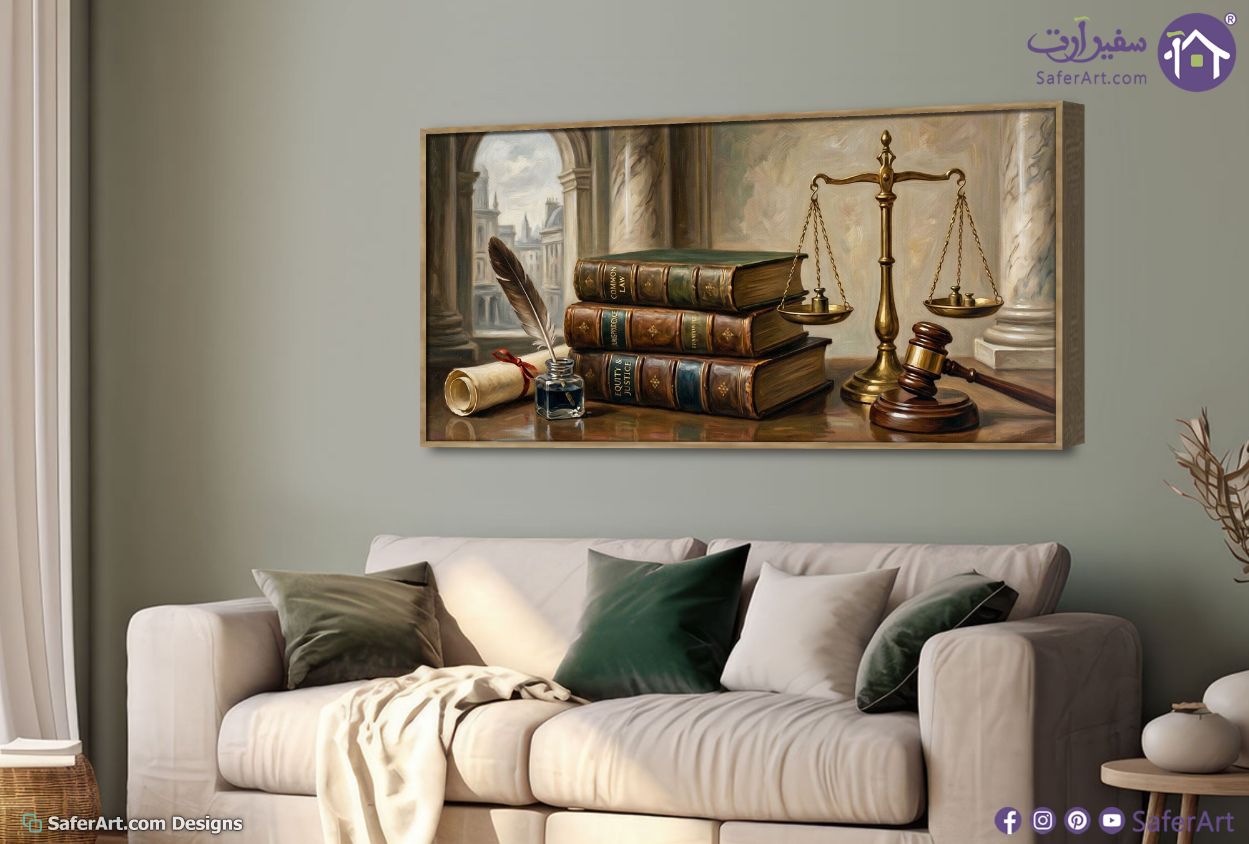 تعتبر هذه القطعة من ارقى لوحات فنية كلاسيكية التي تجسد مفهوم العدالة من خلال اسلوب الرسم الزيتي الواقعي حيث يظهر الميزان والكتب القانونية القديمة مع مطرقة القاضي في تكوين فني متوازن يعكس هيبة القانون بلمسات فنية دقيقة وتفاصيل غنية تبرز جمالية العمارة الكلاسيكية في الخلفية مما يجعلها خيارا مثاليا لديكور المكاتب والشركات التي تبحث عن الفخامة والوقار., متوفر بمقاسات متعددة يمكنك اختيار او تغيير المقاس عند الطلب ,بتصميم مميز لـ تابلوهات مودرن, تابلوهات مودرن , لوحات فنية مودرن اعمال و شركات, قانون - قضاء - محاماه, مبانى و هندسة معمارية, طبيعه صامتة, اماكن و مدن و مباني , التابلوه يغلب عليه الالوان الوان داكنة, بنى - بيج, فضى – ذهبى , و مصمم بالشكل التالى 1 قطعه , بالعرض, ببرواز, برواز خشبى, مستطيل , مناسب لديكور حوائط غرفة الاستقبال, غرفة المعيشة, مكاتب – شركات - اعمال , و هو يتميز بالسمات التالية : الوان زيتية - اكريليك, كلاسيك – نيو كلاسيك, لوحات فنية , متوفر الان فى مصر و يأتى جاهز للتركيب مع دليل التركيب و اكسسوارات التركيب اللازمه