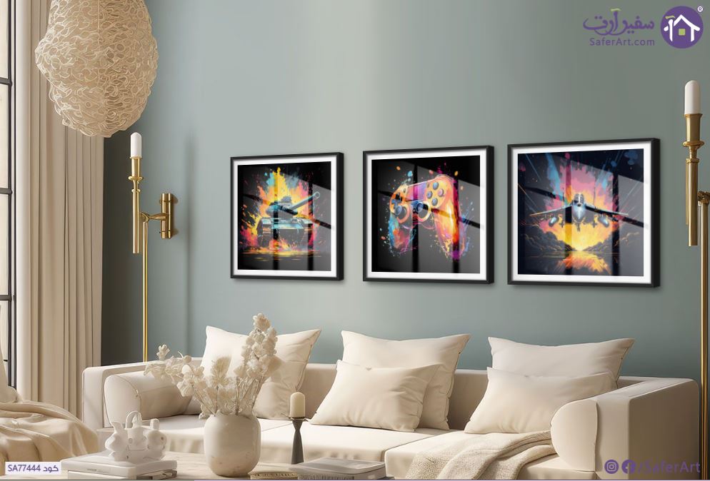 تابلوه مودرن بالوان حيويه و زاهيه من 3 قطع لمحبى الالعاب الالكترونية و البلايستيشن لذراع تحكم و طائره و دبابه برسم ديجيتال مميز, متوفر بمقاسات متعددة يمكنك اختيار او تغيير المقاس عند الطلب ,بتصميم مميز لـ تابلوهات مودرن, تابلوهات مودرن , لوحات فنية مودرن اكشن - مغامرات, جيمنج - العاب و تسليه , التابلوه يغلب عليه الالوان اسود, اللون الواحد, الوان داكنة, برتقالى , و مصمم بالشكل التالى 3 قطع, متعدد القطع ( اى عدد ) , اكريليك, بالعرض, ببرواز, برواز SF9, برواز اسود , مناسب لديكور حوائط غرفة شباب, مكاتب – شركات - اعمال , و هو يتميز بالسمات التالية : الستريشن - فيكتور, مودرن, نيون ستايل , متوفر الان فى مصر و يأتى جاهز للتركيب مع دليل التركيب و اكسسوارات التركيب اللازمه