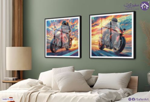 تابلوهات دراجات رياضية حديثة, دراجتين ناريتين رياضيتين يقودهما شخصان يرتديان خوذات على طريق مُعبّد مع خلفية سماء مُلونة بألوان غروب الشمس تُعطي إحساسًا بالحركة والسرعة، مُنفذًا بأسلوب يجمع بين الرسم الرقمي والتأثيرات التي تُحاكي الرسم الزيتي مع استخدام ألوان زاهية وضربات فرشاة واضحة تُعطي ملمسًا فنيًا والتركيز على إظهار حركة الدراجات من خلال زاوية التصوير والخلفية المُتحركة واستخدام الألوان المُتوهجة في السماء لإعطاء إحساس بالحرارة والسرعة، ما يُعزز الإحساس بالإثارة والانطلاق والسرعة ويُوحي بفكرة القيادة على طريق مفتوح والاستمتاع بالحرية., متوفر بمقاسات متعددة يمكنك اختيار او تغيير المقاس عند الطلب ,بتصميم مميز لـ تابلوهات مودرن, تابلوهات مودرن , لوحات فنية مودرن اكشن - مغامرات, دراجات بخارية - موتوسيكلات, رجال, سيارات – دراجات - مواصلات, شخصيات و وجوه , التابلوه يغلب عليه الالوان احمر - نبيتى, ازرق - تركواز, اصفر, برتقالى , و مصمم بالشكل التالى 2 قطعه, متعدد القطع ( اى عدد ) , اكريليك, بالعرض, ببرواز, برواز SF9, برواز اسود, مربع , مناسب لديكور حوائط غرفة شباب, مكاتب – شركات - اعمال , و هو يتميز بالسمات التالية : ديجيتال آرت, لوحات فنية, مودرن , متوفر الان فى مصر و يأتى جاهز للتركيب مع دليل التركيب و اكسسوارات التركيب اللازمه
