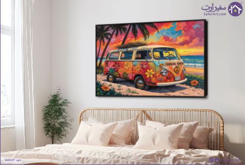 تابلوه مودرن يجسد مشهد سيارة فان كلاسيكية مزينة بالزهور الملونة تقف على شاطئ رملي بجانب اشجار النخيل مع خلفية لسماء الغروب الساحرة و امواج البحر الهادئة، هذا التصميم مرسوم باسلوب فني فريد يعتمد على الالوان الزاهية و ضربات الفرشاة الجريئة التي تضفي حيوية و طابع فينتاج و بوهيمي على اللوحة الفنية., متوفر بمقاسات متعددة يمكنك اختيار او تغيير المقاس عند الطلب ,بتصميم مميز لـ تابلوهات مودرن, تابلوهات مودرن , لوحات فنية مودرن اعمال و شركات, بحار و شواطئ و مراكب, سياحة و سفر, سيارات, سيارات – دراجات - مواصلات, شاطئ البحر , التابلوه يغلب عليه الالوان ازرق - تركواز, اصفر, برتقالى, قوى و زاهى , و مصمم بالشكل التالى 1 قطعه , بالعرض, ببرواز, برواز اسود, مستطيل , مناسب لديكور حوائط غرفة المعيشة, غرفة شباب, مكاتب – شركات - اعمال , و هو يتميز بالسمات التالية : الستريشن - فيكتور, ديجيتال آرت, عتيق - فينتاج, لوحات فنية, مودرن , متوفر الان فى مصر و يأتى جاهز للتركيب مع دليل التركيب و اكسسوارات التركيب اللازمه