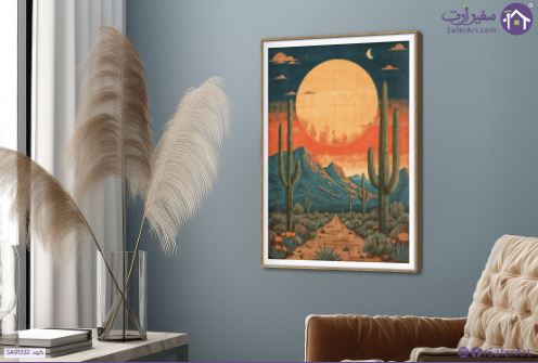 تابلوه منظر طبيعى صبار وقت الغروب، يظهر التابلوه منظراً طبيعياً صحراوياً وقت الغروب، حيث تتوسطه طريق رملية تمتد بين نباتات الصبار المتنوعة وشجيرات صحراوية صغيرة، بينما ترتفع في الخلفية سلسلة جبلية ذات قمم صخرية مضاءة بضوء خافت، ويملأ السماء قرص شمس كبير يضيء المشهد، مع وجود بعض الغيوم المتناثرة ونجوم قليلة في الأعلى، بينما يعتمد التصميم على أسلوب فني يجمع بين الواقعية والتعبيرية، مستخدماً ألواناً دافئة وهادئة، مع إبراز تفاصيل النباتات والجبال بضربات فرشاة واضحة، مما يخلق مشهداً هادئاً وساحراً يعكس جمال الطبيعة الصحراوية في الليل., متوفر بمقاسات متعددة يمكنك اختيار او تغيير المقاس عند الطلب ,بتصميم مميز لـ تابلوهات مودرن, تابلوهات مودرن , لوحات فنية مودرن جبال, مناظر طبيعية, نبات الصبار, ورود - زهور - نباتات , التابلوه يغلب عليه الالوان اخضر - زيتى, الوان داكنة, برتقالى , و مصمم بالشكل التالى 1 قطعه , بالطول, ببرواز, برواز SF9, برواز خشبى, مستطيل , مناسب لديكور حوائط غرفة الاستقبال, غرفة المعيشة, مدخل المنزل, مكاتب – شركات - اعمال , و هو يتميز بالسمات التالية : تماثل - سيميترى, ديجيتال آرت, لوحات فنية, مودرن , متوفر الان فى مصر و يأتى جاهز للتركيب مع دليل التركيب و اكسسوارات التركيب اللازمه