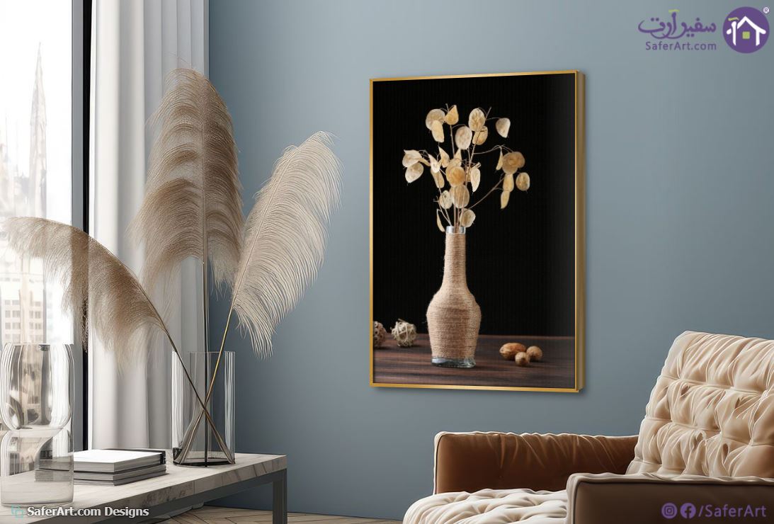 يمثل هذا التصميم تابلوه مودرن يجمع بين البساطة الريفية والاناقة العصرية من خلال تصوير فوتوغرافي بأسلوب الطبيعة الصامتة يبرز تفاصيل زجاجة ملفوفة بخيوط الخيش تضم أغصان نباتية مجففة فوق سطح خشبي دافئ وخلفية سوداء عميقة تمنح المشهد عمقا بصريا وتركيزا عاليا على الملامس الطبيعية المتنوعة بتباين لوني جذاب يضيف لمسة من الهدوء والجمال لاي فراغ داخلي, متوفر بمقاسات متعددة يمكنك اختيار او تغيير المقاس عند الطلب ,بتصميم مميز لـ تابلوهات مودرن, تابلوهات مودرن , لوحات فنية مودرن اوراق شجر - نباتات, فازات و اوانى, طبيعه صامتة, ورود - زهور - نباتات , التابلوه يغلب عليه الالوان اسود, الوان داكنة, بنى - بيج , و مصمم بالشكل التالى 1 قطعه , بالطول, ببرواز, برواز ذهبى, مستطيل , مناسب لديكور حوائط غرفة الاستقبال, غرفة الطعام - المطبخ, غرفة المعيشة, غرفة النوم, مدخل المنزل, مكاتب – شركات - اعمال , و هو يتميز بالسمات التالية : بسيط و هادئ, بوهو ستايل, صور فوتوغرافية, مودرن , متوفر الان فى مصر و يأتى جاهز للتركيب مع دليل التركيب و اكسسوارات التركيب اللازمه