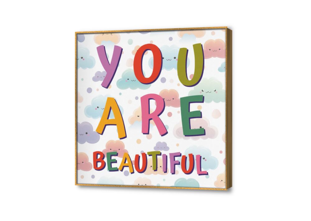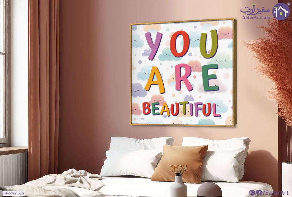 لوحة فنية لكلمات انجليزية مشجعة ( you are beautiful) مكتوبة بألوان مبهجة للأطفال كل حرف بلون مختلف مع نقوش سحابية رقيقة في الخلفية ملونة مناسبة لغرف الأطفال وغرف البنات, متوفر بمقاسات متعددة يمكنك اختيار او تغيير المقاس عند الطلب ,بتصميم مميز لـ تابلوهات مودرن, تابلوهات مودرن , لوحات فنية مودرن English Text & Quotes , التابلوه يغلب عليه الالوان ابيض - اوف وايت, متعدد الالوان , و مصمم بالشكل التالى 1 قطعه , ببرواز, برواز ذهبى, مربع , مناسب لديكور حوائط غرفة المعيشة, غرفة بنات , و هو يتميز بالسمات التالية : الوان مائية, ديجيتال آرت, قابل للتعديل, كتابات و حروف, مودرن , متوفر الان فى مصر و يأتى جاهز للتركيب مع دليل التركيب و اكسسوارات التركيب اللازمه