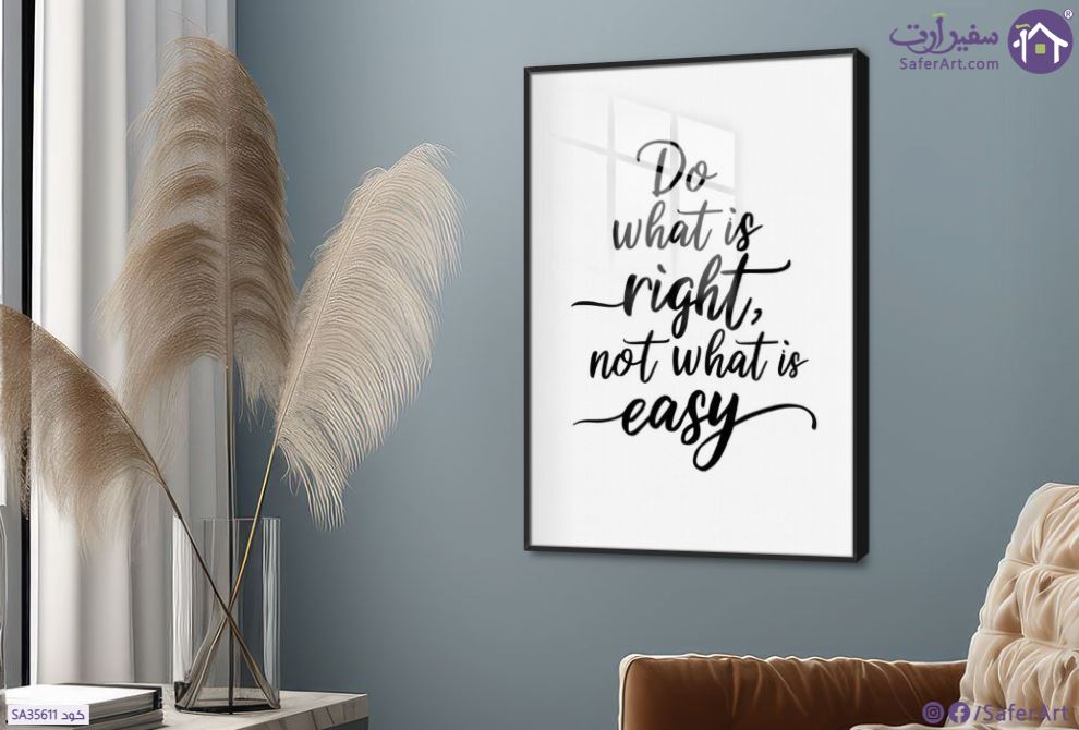 Do what is right, not what is easy. إفعل ما هو صحيح ليس ماهو سهل.. كلمات مكتوبة باللغة الإنجليزية باللون الأسود على خلفية بيضاء تابلوه محفز مناسب لغرف الشباب., متوفر بمقاسات متعددة يمكنك اختيار او تغيير المقاس عند الطلب ,بتصميم مميز لـ تابلوهات مودرن, تابلوهات مودرن , لوحات فنية مودرن English Text & Quotes , التابلوه يغلب عليه الالوان ابيض - اوف وايت, ابيض و اسود, اللون الواحد , و مصمم بالشكل التالى 1 قطعه , اكريليك, بالطول, ببرواز, برواز اسود, مستطيل , مناسب لديكور حوائط غرفة المعيشة, غرفة شباب, مكاتب – شركات - اعمال , و هو يتميز بالسمات التالية : الستريشن - فيكتور, بسيط و هادئ, قابل للتعديل, كتابات و حروف, مودرن , متوفر الان فى مصر و يأتى جاهز للتركيب مع دليل التركيب و اكسسوارات التركيب اللازمه