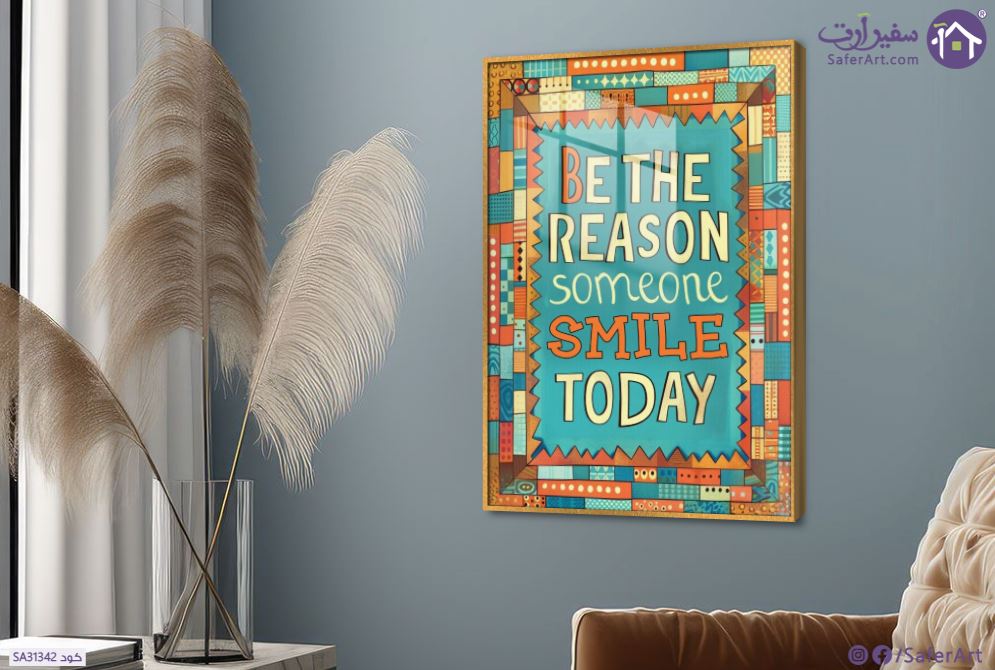 be the reason someone smiles today.. " كن السبب في ابتسامة شخص ما اليوم " تابلوه مودرن بألوان مبهجة ، أخضر وأصفر وبرتقالي, متوفر بمقاسات متعددة يمكنك اختيار او تغيير المقاس عند الطلب ,بتصميم مميز لـ تابلوهات مودرن, تابلوهات مودرن , لوحات فنية مودرن English Text & Quotes , التابلوه يغلب عليه الالوان ازرق - تركواز, اصفر, برتقالى , و مصمم بالشكل التالى 1 قطعه , اكريليك, بالطول, ببرواز, برواز ذهبى, مستطيل , مناسب لديكور حوائط غرفة المعيشة, غرفة شباب, مكاتب – شركات - اعمال , و هو يتميز بالسمات التالية : الستريشن - فيكتور, كتابات و حروف, لوحات فنية , متوفر الان فى مصر و يأتى جاهز للتركيب مع دليل التركيب و اكسسوارات التركيب اللازمه