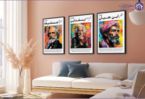 تابلوه علماء مؤثرين, ثلاث شخصيات بارزة: ديمتري مندليف، ألبرت أينشتاين، وجابر بن حيان. هؤلاء العلماء لهم مساهمات كبيرة في مجالات الكيمياء والفيزياء, موضح اسمائهم و تاريخ ميلادهم, و كذلك نبذه عن اسهاماتهم فى العلم و الحياه, بتصميم فنى مميز بالوان حيويه و زاهية مرسوم باسلوب الرسم الزيتى., متوفر بمقاسات متعددة يمكنك اختيار او تغيير المقاس عند الطلب ,بتصميم مميز لـ تابلوهات مودرن, تابلوهات مودرن , لوحات فنية مودرن رجال, مميزة و مختارة, شخصيات و وجوه , التابلوه يغلب عليه الالوان احمر - نبيتى, اسود, اصفر, بينك – فوشيا, متعدد الالوان , و مصمم بالشكل التالى 3 قطع, متعدد القطع ( اى عدد ) , بالعرض, ببرواز, برواز اسود, مستطيل , مناسب لديكور حوائط غرفة شباب, مكاتب – شركات - اعمال , و هو يتميز بالسمات التالية : الوان زيتية - اكريليك, كتابات و حروف, لوحات فنية, مودرن , متوفر الان فى مصر و يأتى جاهز للتركيب مع دليل التركيب و اكسسوارات التركيب اللازمه