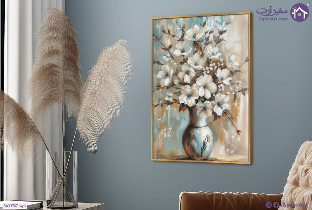 لوحة فنية  رسم لفازة بها ورود صغيرة بيضاء رقيقة برسم تجريدي مودرن بتدرجات اللونين الأزرق والبني .., متوفر بمقاسات متعددة يمكنك اختيار او تغيير المقاس عند الطلب ,بتصميم مميز لـ تابلوهات مودرن, تابلوهات مودرن , لوحات فنية مودرن فازات و اوانى, طبيعه صامتة, ورود - زهور - نباتات , التابلوه يغلب عليه الالوان ابيض - اوف وايت, ازرق - تركواز, بنى - بيج , و مصمم بالشكل التالى 1 قطعه , بالطول, ببرواز, برواز ذهبى, مستطيل , مناسب لديكور حوائط غرفة الاستقبال, غرفة المعيشة, غرفة النوم, مدخل المنزل, مكاتب – شركات - اعمال , و هو يتميز بالسمات التالية : الوان زيتية - اكريليك, عتيق - فينتاج, كلاسيك – نيو كلاسيك, لوحات فنية , متوفر الان فى مصر و يأتى جاهز للتركيب مع دليل التركيب و اكسسوارات التركيب اللازمه