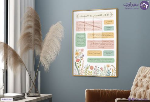 تابلوهات اذكار الصباح و المساء، يظهر التابلوه تصميمًا لأذكار الصباح والمساء، حيث تتوزع النصوص العربية بخطوط واضحة ومنسقة على خلفية بيضاء مزينة برسومات زهور ملونة في الأسفل، مع استخدام ألوان هادئة ومريحة للعين في النصوص والخلفية، بينما يعتمد التصميم على أسلوب عصري وبسيط في توزيع العناصر، مع التركيز على وضوح النصوص وسهولة القراءة، مما يخلق جواً من الهدوء والسكينة., متوفر بمقاسات متعددة يمكنك اختيار او تغيير المقاس عند الطلب ,بتصميم مميز لـ تابلوهات مودرن, تابلوهات مودرن , لوحات فنية مودرن اذكار و ادعية, اسلامى - ايات قرآنية و خط عربى , التابلوه يغلب عليه الالوان اخضر - زيتى, برتقالى, بينك – فوشيا, متعدد الالوان , و مصمم بالشكل التالى 1 قطعه , اكريليك, بالطول, ببرواز, برواز ذهبى, مستطيل , مناسب لديكور حوائط غرفة اطفال, غرفة الاستقبال, غرفة المعيشة, غرفة النوم, غرفة بنات , و هو يتميز بالسمات التالية : الستريشن - فيكتور, بسيط و هادئ, ديجيتال آرت, قابل للتعديل, كتابات و حروف, مودرن , متوفر الان فى مصر و يأتى جاهز للتركيب مع دليل التركيب و اكسسوارات التركيب اللازمه