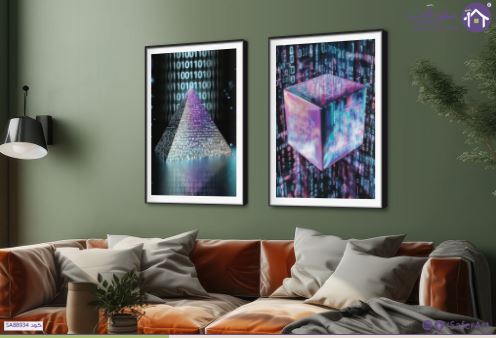 تابلوه مودرن كانفس مكعب و هرم بتصميم تكنولوجى من المستقبل, مكون من قطعتين, الأولى لهرم ثلاثي الأبعاد مُغطى بأرقام ثنائية على خلفية سوداء مع انعكاس ضوئي أزرق، والثانية لمكعب ثلاثي الأبعاد مُحاط ومُغطى أيضًا بأرقام ثنائية مُلونة على خلفية مُشابهة, مع التركيز على المنظور والإضاءة لخلق إحساس بالعمق والبعد الثالث في الأشكال الهندسية واستخدام الأرقام الثنائية لإعطاء ملمس رقمي وتكنولوجي وإضافة الألوان المُتداخلة لمسة فنية وجمالية، ما يُعزز الإحساس بالتكنولوجيا والمعلومات والبيانات ويُوحي بفكرة تمثيل البيانات الرقمية بأشكال هندسية بطريقة بصرية مُبتكرة., متوفر بمقاسات متعددة يمكنك اختيار او تغيير المقاس عند الطلب ,بتصميم مميز لـ تابلوهات مودرن, تابلوهات مودرن , لوحات فنية مودرن اعمال و شركات, تكنولوجى و معلومات, اشكال هندسية و زخارف , التابلوه يغلب عليه الالوان ازرق - تركواز, اسود, الوان داكنة, موف – ارجوانى , و مصمم بالشكل التالى 2 قطعه, متعدد القطع ( اى عدد ) , بالطول, ببرواز, برواز SF9, برواز اسود, مستطيل , مناسب لديكور حوائط غرفة شباب, مكاتب – شركات - اعمال , و هو يتميز بالسمات التالية : اشكال هندسية و زخارف, ديجيتال آرت, كتابات و حروف, مثلثات, مربعات, مودرن, نيون ستايل , متوفر الان فى مصر و يأتى جاهز للتركيب مع دليل التركيب و اكسسوارات التركيب اللازمه