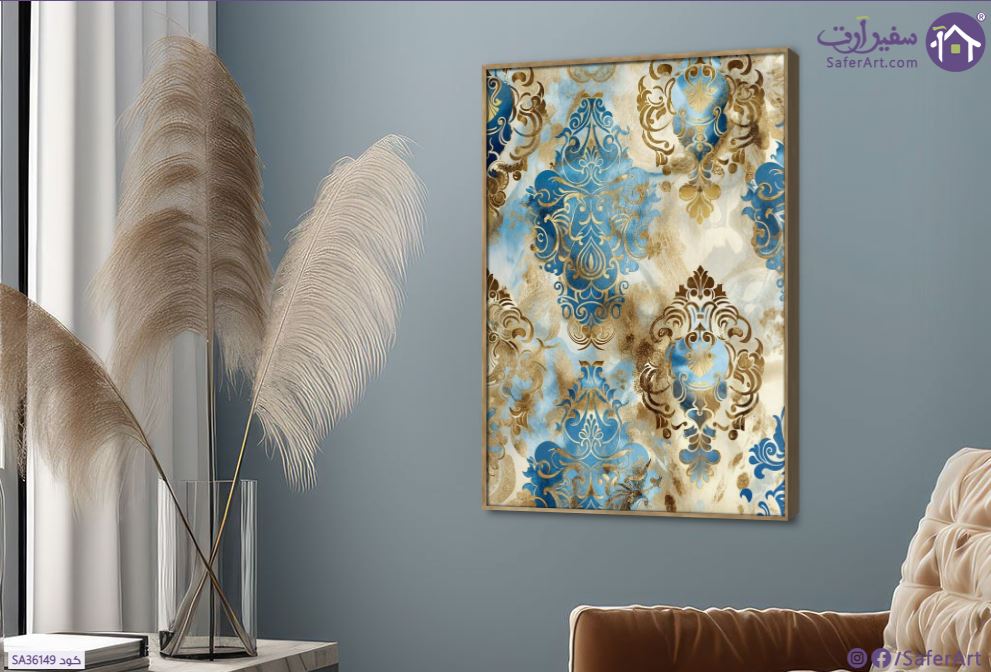 لوحة فنية مودرن، زخارف ونقوش هندسية باللونين الأزرق والذهبي على خلفية باللون البيج الفاتح بتصميم مودرن وأنيق., متوفر بمقاسات متعددة يمكنك اختيار او تغيير المقاس عند الطلب ,بتصميم مميز لـ تابلوهات مودرن, تابلوهات مودرن , لوحات فنية مودرن زخارف اسلامية, اسلامى - ايات قرآنية و خط عربى , التابلوه يغلب عليه الالوان ازرق - تركواز, بنى - بيج, فضى – ذهبى , و مصمم بالشكل التالى 1 قطعه , بالطول, ببرواز, برواز خشبى, مستطيل , مناسب لديكور حوائط غرفة الاستقبال, غرفة المعيشة, مدخل المنزل, مكاتب – شركات - اعمال , و هو يتميز بالسمات التالية : ديجيتال آرت, مودرن , متوفر الان فى مصر و يأتى جاهز للتركيب مع دليل التركيب و اكسسوارات التركيب اللازمه