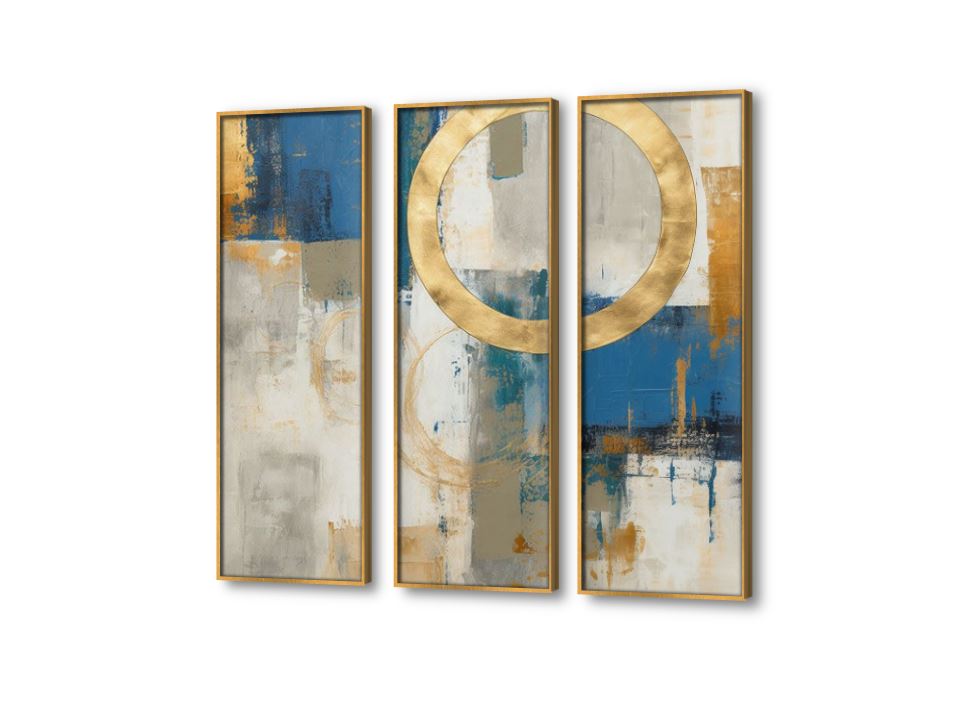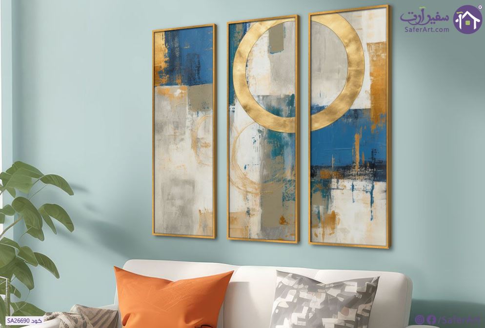 لمحبي الفن التجريدي؛ تابلوه مودرن لرسم تجريدي وأشكال هندسية ، دوائر باللون الذهبي  والفضي مع اللون الأزرق، تابلوه مصمم بشكل جذاب., متوفر بمقاسات متعددة يمكنك اختيار او تغيير المقاس عند الطلب ,بتصميم مميز لـ تابلوهات مودرن, تابلوهات مودرن , لوحات فنية مودرن اشكال هندسية و زخارف, تجريدي , التابلوه يغلب عليه الالوان ازرق - تركواز, رمادى, فضى – ذهبى , و مصمم بالشكل التالى 3 قطع, متعدد القطع ( اى عدد ) , بالطول, ببرواز, برواز ذهبى, مستطيل , مناسب لديكور حوائط غرفة الاستقبال, غرفة المعيشة, مدخل المنزل, مكاتب – شركات - اعمال , و هو يتميز بالسمات التالية : اشكال هندسية و زخارف, الوان زيتية - اكريليك, دوائر, لوحات فنية, مودرن , متوفر الان فى مصر و يأتى جاهز للتركيب مع دليل التركيب و اكسسوارات التركيب اللازمه