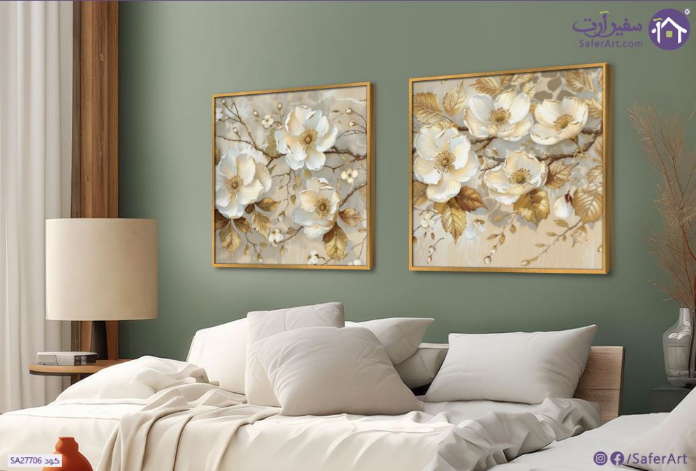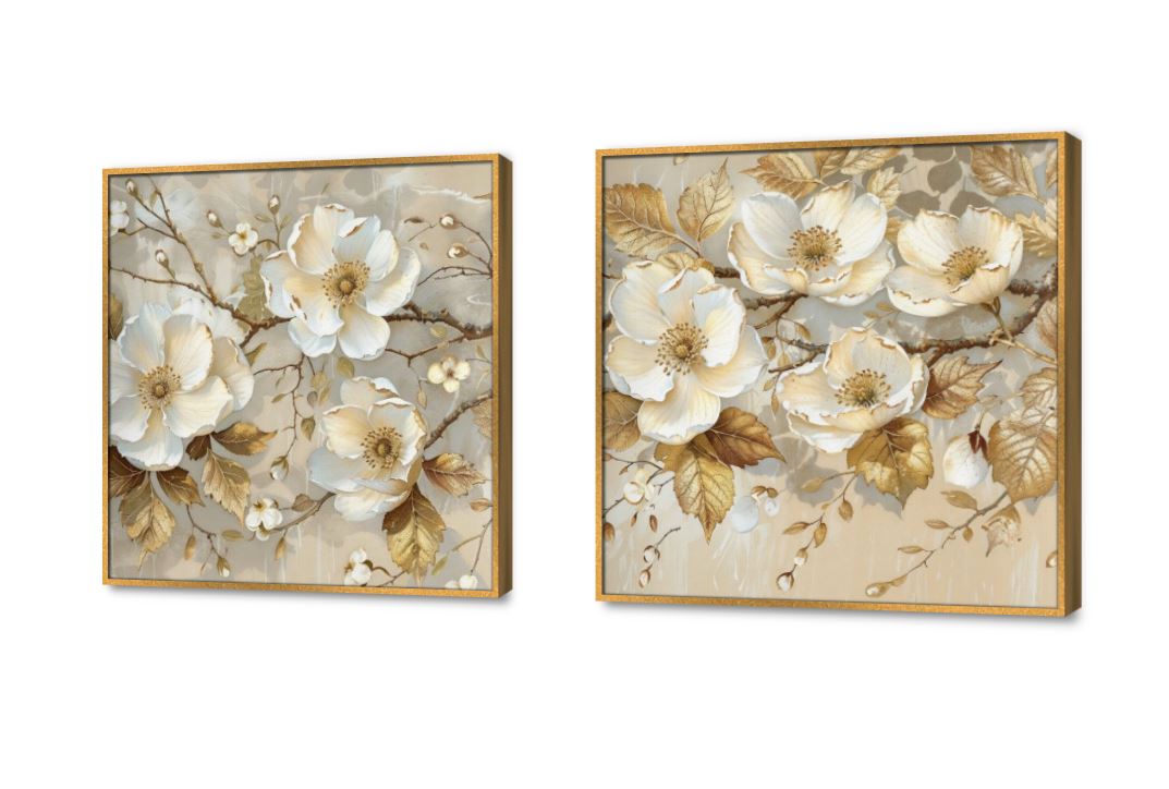 تابلوه مودرن من قطعتين لمجموعة ورود بيضاء صغيرة على خلفية باللون الذهبي إضافة للفخامة والأناقة لديكور منزلك>, متوفر بمقاسات متعددة يمكنك اختيار او تغيير المقاس عند الطلب ,بتصميم مميز لـ تابلوهات مودرن, تابلوهات مودرن , لوحات فنية مودرن ورود - زهور - نباتات , التابلوه يغلب عليه الالوان ابيض - اوف وايت, فضى – ذهبى , و مصمم بالشكل التالى 2 قطعه, متعدد القطع ( اى عدد ) , بالعرض, ببرواز, برواز ذهبى, مستطيل , مناسب لديكور حوائط غرفة الاستقبال, غرفة المعيشة, غرفة النوم, مدخل المنزل, مكاتب – شركات - اعمال , و هو يتميز بالسمات التالية : الوان زيتية - اكريليك, بسيط و هادئ, لوحات فنية, مودرن , متوفر الان فى مصر و يأتى جاهز للتركيب مع دليل التركيب و اكسسوارات التركيب اللازمه