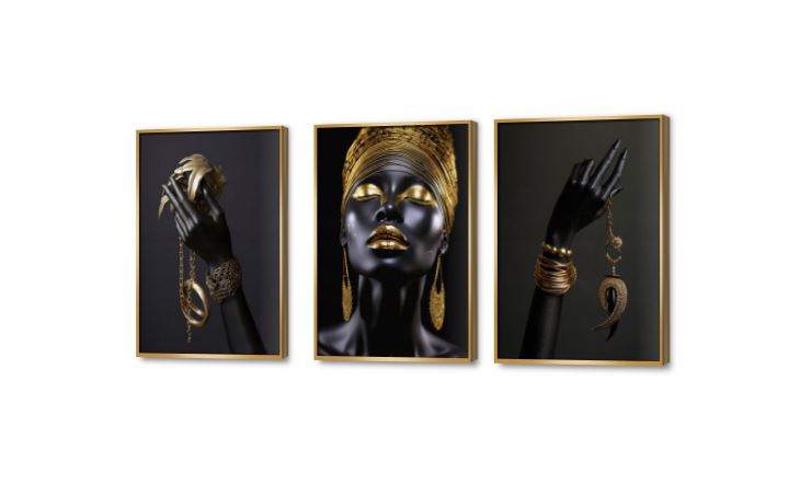 تابلوه مودرن مكون من 3 قطع لبنت و مجموعه من الحلى الذهبية بتصميم بتفاصيل دقيقه بالوان الاسود و الذهبى بمظهر فاخر و مميز, متوفر بمقاسات متعددة يمكنك اختيار او تغيير المقاس عند الطلب ,بتصميم مميز لـ تابلوهات مودرن, تابلوهات مودرن , لوحات فنية مودرن افريقى, بنات, شخصيات و وجوه , التابلوه يغلب عليه الالوان اسود, اللون الواحد, الوان داكنة, فضى – ذهبى , و مصمم بالشكل التالى 3 قطع, متعدد القطع ( اى عدد ) , بالعرض, ببرواز, برواز ذهبى, مستطيل , مناسب لديكور حوائط غرفة المعيشة, غرفة النوم, مدخل المنزل, مكاتب – شركات - اعمال , و هو يتميز بالسمات التالية : الفن الافريقى, صور فوتوغرافية, مودرن , متوفر الان فى مصر و يأتى جاهز للتركيب مع دليل التركيب و اكسسوارات التركيب اللازمه
