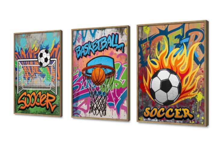مجموعة تابلوهات عصرية مكونة من ثلاث قطع تصور شغف الرياضة بأسلوب فن الشارع الجرافيتي المليء بالحياة حيث تعرض كل قطعة مشهد رياضي مختلف لكرة القدم وكرة السلة مع خلفيات ملونة وخطوط ديناميكية وكتابات جريئة تعبر عن الطاقة والحماس وتضفي لمسة شبابية وحيوية على اي جدار., متوفر بمقاسات متعددة يمكنك اختيار او تغيير المقاس عند الطلب ,بتصميم مميز لـ تابلوهات مودرن, تابلوهات مودرن , لوحات فنية مودرن English Text & Quotes, اعمال و شركات, جيمنج - العاب و تسليه, رياضات, هوايات , التابلوه يغلب عليه الالوان ازرق - تركواز, برتقالى, قوى و زاهى, متعدد الالوان , و مصمم بالشكل التالى 3 قطع, متعدد القطع ( اى عدد ) , بالعرض, ببرواز, برواز خشبى, مستطيل , مناسب لديكور حوائط غرفة اطفال, غرفة المعيشة, غرفة شباب , و هو يتميز بالسمات التالية : الستريشن - فيكتور, ديجيتال آرت, كتابات و حروف, مودرن , متوفر الان فى مصر و يأتى جاهز للتركيب مع دليل التركيب و اكسسوارات التركيب اللازمه