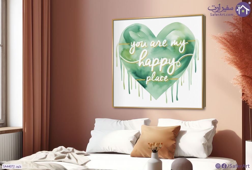تابلوه مودرن رومانسي، لإحدى الجمل الرومانسية باللغة الإنجليزية " you are my happy place" داخل قلب باللون الفيروزي على خلفية بيضاء بتصميم مودرن رقيق., متوفر بمقاسات متعددة يمكنك اختيار او تغيير المقاس عند الطلب ,بتصميم مميز لـ تابلوهات مودرن, تابلوهات مودرن , لوحات فنية مودرن قلوب, English Text & Quotes, رومانسى , التابلوه يغلب عليه الالوان ابيض - اوف وايت, اخضر - زيتى , و مصمم بالشكل التالى 1 قطعه , ببرواز, برواز ذهبى, مربع , مناسب لديكور حوائط غرفة المعيشة, غرفة النوم , و هو يتميز بالسمات التالية : الوان مائية, ديجيتال آرت, كتابات و حروف, مودرن , متوفر الان فى مصر و يأتى جاهز للتركيب مع دليل التركيب و اكسسوارات التركيب اللازمه