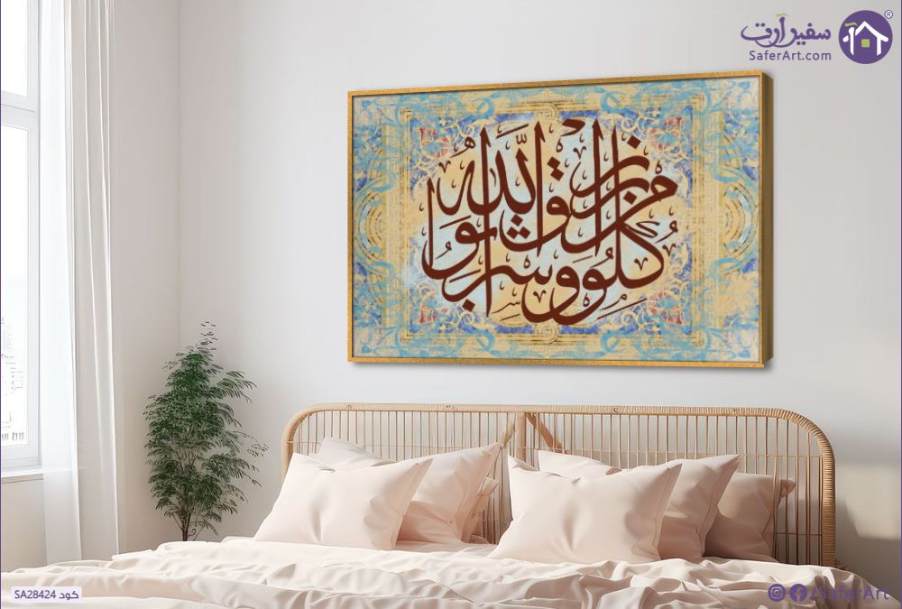 "كلوا واشربوا من رزق الله" تابلوه مودرن لبعض الآيات القرآنية بكتابة عربية ونقوش إسلامية بتصميم مودرن وألوان جذابة, متوفر بمقاسات متعددة يمكنك اختيار او تغيير المقاس عند الطلب ,بتصميم مميز لـ تابلوهات مودرن, تابلوهات مودرن , لوحات فنية مودرن ايات قرآنية و خط عربى, اسلامى - ايات قرآنية و خط عربى , التابلوه يغلب عليه الالوان ازرق - تركواز, اصفر, بنى - بيج , و مصمم بالشكل التالى 1 قطعه , بالعرض, ببرواز, برواز ذهبى, مستطيل , مناسب لديكور حوائط غرفة الاستقبال, غرفة المعيشة, مدخل المنزل, مكاتب – شركات - اعمال , و هو يتميز بالسمات التالية : ديجيتال آرت, قابل للتعديل, كتابات و حروف, مودرن , متوفر الان فى مصر و يأتى جاهز للتركيب مع دليل التركيب و اكسسوارات التركيب اللازمه