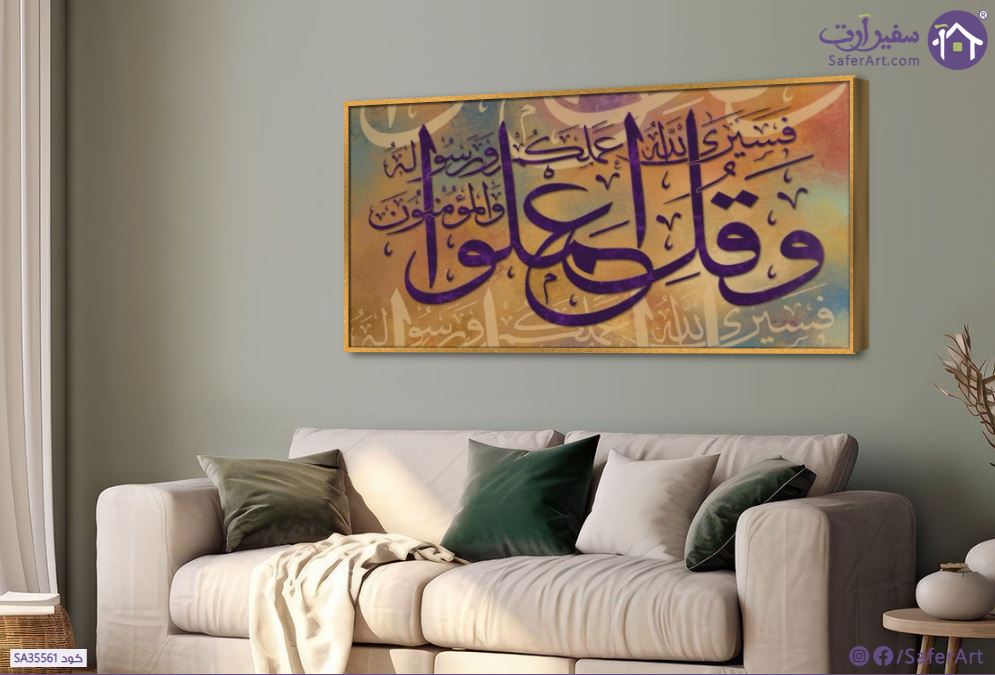 وقل اعملوا فسيرى الله عملكم ورسوله والمؤمنون .. تابلوه مودرن بكتابة عربية ونقوش إسلامية باللون الموف الأرجواني على خلفية بمزيج من البيج والأورانج  ، تابلوه مميز لمحبي الفن الإسلامي .., متوفر بمقاسات متعددة يمكنك اختيار او تغيير المقاس عند الطلب ,بتصميم مميز لـ تابلوهات مودرن, تابلوهات مودرن , لوحات فنية مودرن ايات قرآنية و خط عربى, اسلامى - ايات قرآنية و خط عربى , التابلوه يغلب عليه الالوان برتقالى, فضى – ذهبى, موف – ارجوانى , و مصمم بالشكل التالى 1 قطعه , بالعرض, ببرواز, برواز ذهبى, مستطيل , مناسب لديكور حوائط غرفة الاستقبال, غرفة المعيشة, غرفة نوم, مدخل المنزل, مكاتب – شركات - اعمال , و هو يتميز بالسمات التالية : ديجيتال آرت, قابل للتعديل, كتابات و حروف, لوحات فنية, مودرن , متوفر الان فى مصر و يأتى جاهز للتركيب مع دليل التركيب و اكسسوارات التركيب اللازمه