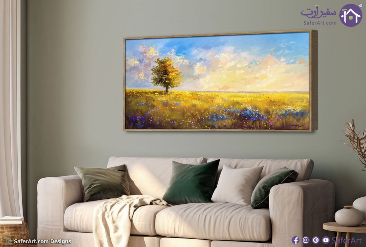 يجسد هذا التصميم تابلوه مودرن كانفاس مشهد طبيعي يبعث على الراحة والسكينة حيث تظهر فيه حقول واسعة من الازهار الملونة تحت سماء مشرقة تتداخل فيها الوان الشمس الذهبية مع السحب بأسلوب فني انطباعي يعتمد على ضربات الفرشاة البارزة والملمس الغني الذي يضفي حيوية وعمق على اللوحة ويجعلها قطعة ديكور فريدة تضفي لمسة جمالية دافئة على جدران منزلك العصري., متوفر بمقاسات متعددة يمكنك اختيار او تغيير المقاس عند الطلب ,بتصميم مميز لـ تابلوهات مودرن, تابلوهات مودرن , لوحات فنية مودرن اشجار, مناظر طبيعية, ورود - زهور - نباتات , التابلوه يغلب عليه الالوان ابيض - اوف وايت, اخضر - زيتى, ازرق - تركواز, اصفر, بنى - بيج , و مصمم بالشكل التالى 1 قطعه , بالعرض, ببرواز, برواز خشبى, مستطيل , مناسب لديكور حوائط غرفة الاستقبال, غرفة المعيشة, غرفة النوم, مدخل المنزل, مكاتب – شركات - اعمال , و هو يتميز بالسمات التالية : الوان زيتية - اكريليك, بسيط و هادئ, لوحات فنية, مظهر بارز, مودرن , متوفر الان فى مصر و يأتى جاهز للتركيب مع دليل التركيب و اكسسوارات التركيب اللازمه