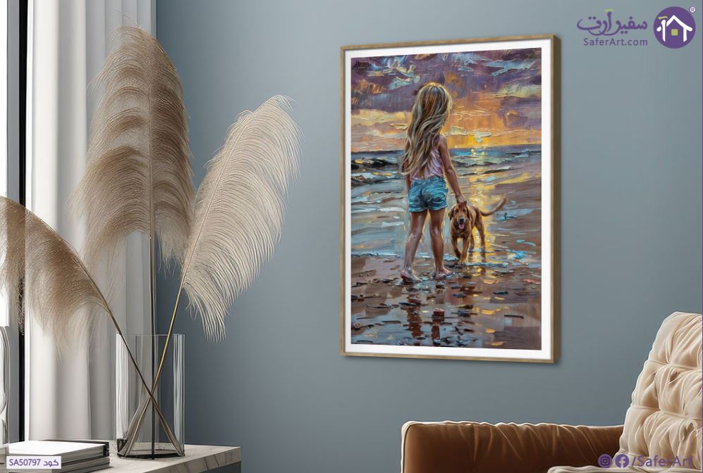 لوحات ديكور فتاة صغيرة مع كلب على الشاطئ