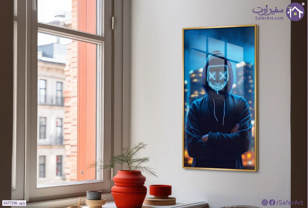 تابلوه مودرن لشاب يرتدى سويتشيرت و قناع نيون ازرق, متوفر بمقاسات متعددة يمكنك اختيار او تغيير المقاس عند الطلب ,بتصميم مميز لـ تابلوهات مودرن, تابلوهات مودرن , لوحات فنية مودرن اكشن - مغامرات, رجال, شخصيات و وجوه , التابلوه يغلب عليه الالوان ازرق - تركواز, الوان داكنة , و مصمم بالشكل التالى 1 قطعه , بالطول, اكريليك, ببرواز, برواز ذهبى, مستطيل , مناسب لديكور حوائط غرفة شباب , و هو يتميز بالسمات التالية : ديجيتال آرت, صور فوتوغرافية, مودرن, نيون ستايل , متوفر الان فى مصر و يأتى جاهز للتركيب مع دليل التركيب و اكسسوارات التركيب اللازمه