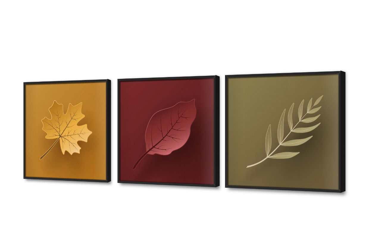 طقم لوحات ديكور يجسد جمال الطبيعة في فصل الخريف من خلال ثلاث قطع فنية تعرض أوراق شجر متنوعة بأسلوب التصميم الرقمي الحديث الذي يعتمد على البساطة وتناسق الألوان الدافئة مثل الأحمر والذهبي والأخضر الزيتي مع لمسات من الظلال التي تعطي مظهرا بارزا للورقة فوق الخلفية الملونة لتضفي لمسة من الرقي والهدوء على جدران منزلك., متوفر بمقاسات متعددة يمكنك اختيار او تغيير المقاس عند الطلب ,بتصميم مميز لـ تابلوهات مودرن, تابلوهات مودرن , لوحات فنية مودرن اوراق شجر - نباتات, ورود - زهور - نباتات , التابلوه يغلب عليه الالوان احمر - نبيتى, اخضر - زيتى, اصفر, الوان داكنة , و مصمم بالشكل التالى 3 قطع, متعدد القطع ( اى عدد ) , بالعرض, ببرواز, برواز اسود, مربع , مناسب لديكور حوائط غرفة الاستقبال, غرفة المعيشة, غرفة النوم, مدخل المنزل, مكاتب – شركات - اعمال , و هو يتميز بالسمات التالية : الستريشن - فيكتور, بسيط و هادئ, ديجيتال آرت, مودرن , متوفر الان فى مصر و يأتى جاهز للتركيب مع دليل التركيب و اكسسوارات التركيب اللازمه