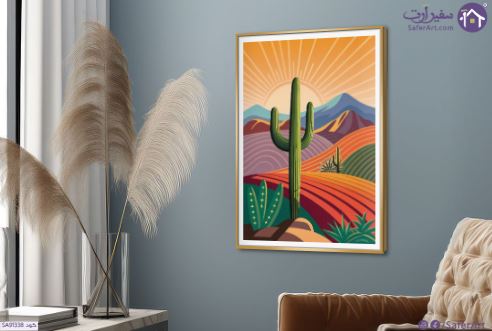 تابلوه منظر طبيعى للصبار بالوان زاهية، منظراً طبيعياً صحراوياً مشرقاً عند شروق الشمس، حيث يتوسطه صبار عملاق ذو فرعين، يقف على تلة صغيرة، بينما تمتد خلفه تلال وجبال متدرجة الألوان بين البنفسجي والأزرق والبني، وتشرق الشمس الذهبية من الأفق بأشعتها المنتشرة في السماء البرتقالية، مع وجود بعض نباتات الصبار الصغيرة والشجيرات الصحراوية في المقدمة، بينما يعتمد التصميم على أسلوب فني مسطح وبسيط، مستخدماً ألواناً زاهية ومحددة لكل عنصر دون تداخل كبير في الظلال، مع خطوط واضحة ومستقيمة لتحديد التلال وأشعة الشمس، مما يخلق عملاً فنياً عصرياً يعكس جمال الصحراء وحيويتها في بداية النهار., متوفر بمقاسات متعددة يمكنك اختيار او تغيير المقاس عند الطلب ,بتصميم مميز لـ تابلوهات مودرن, تابلوهات مودرن , لوحات فنية مودرن مميزة و مختارة, نبات الصبار, ورود - زهور - نباتات , التابلوه يغلب عليه الالوان اخضر - زيتى, اصفر, برتقالى, قوى و زاهى, متعدد الالوان, موف – ارجوانى , و مصمم بالشكل التالى 1 قطعه , بالطول, ببرواز, برواز SF9, برواز ذهبى, مستطيل , مناسب لديكور حوائط غرفة الاستقبال, غرفة المعيشة, مدخل المنزل, مكاتب – شركات - اعمال , و هو يتميز بالسمات التالية : الستريشن - فيكتور, ديجيتال آرت, مودرن , متوفر الان فى مصر و يأتى جاهز للتركيب مع دليل التركيب و اكسسوارات التركيب اللازمه
