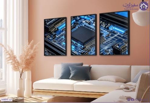 تابلوه حائط لوحه الكترونيه مع معالج باستايل نيون, ثلاثة أجزاء منفصلة تُشكّل معًا صورة مُكبّرة للوحة إلكترونية أو "اللوحة الأم" باللون الأزرق الداكن مع خطوط ونقاط فضية وبيضاء تُشير إلى الدوائر الإلكترونية ومُعالج رئيسي أسود في المنتصف، مُنفذًا بأسلوب التصوير الفوتوغرافي المقرب (الماكرو) مع التركيز على إبراز التفاصيل الدقيقة للمكونات الإلكترونية والدوائر الكهربائية واستخدام الإضاءة لخلق تباين بين الألوان وإبراز لمعان بعض الأجزاء المعدنية., متوفر بمقاسات متعددة يمكنك اختيار او تغيير المقاس عند الطلب ,بتصميم مميز لـ تابلوهات مودرن, تابلوهات مودرن , لوحات فنية مودرن اعمال و شركات, تكنولوجى, تكنولوجى و معلومات , التابلوه يغلب عليه الالوان ازرق - تركواز, اسود , و مصمم بالشكل التالى 3 قطع, متعدد القطع ( اى عدد ) , بالعرض, ببرواز, برواز اسود, مستطيل , مناسب لديكور حوائط غرفة شباب, مكاتب – شركات - اعمال , و هو يتميز بالسمات التالية : صور فوتوغرافية, مودرن, نيون ستايل , متوفر الان فى مصر و يأتى جاهز للتركيب مع دليل التركيب و اكسسوارات التركيب اللازمه