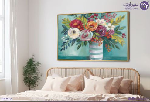 لوحة فنية تصور باقة من الزهور الملونة بألوان زاهية ومتنوعة مثل الأحمر والأصفر والأبيض موضوعة داخل فازة مقلمة باللونين الأبيض والأزرق الفاتح، مرسومة بأسلوب انطباعي حديث بلمسات فرشاة جريئة وواضحة تضفي على التكوين حيوية وبهجة مع خلفية بلون تركواز هادئ يعزز من جمال الألوان ويبرز تفاصيل الزهور وأوراق الشجر الخضراء., متوفر بمقاسات متعددة يمكنك اختيار او تغيير المقاس عند الطلب ,بتصميم مميز لـ تابلوهات مودرن, تابلوهات مودرن , لوحات فنية مودرن اوراق شجر - نباتات, طبيعه صامتة, فازات و اوانى, ورود - زهور - نباتات , التابلوه يغلب عليه الالوان ابيض - اوف وايت, اخضر - زيتى, برتقالى, بينك – فوشيا, متعدد الالوان , و مصمم بالشكل التالى 1 قطعه , بالعرض, ببرواز, برواز ذهبى, مستطيل , مناسب لديكور حوائط غرفة الاستقبال, غرفة المعيشة, غرفة النوم, غرفة بنات, مدخل المنزل, مكاتب – شركات - اعمال , و هو يتميز بالسمات التالية : الوان زيتية - اكريليك, كلاسيك – نيو كلاسيك, لوحات فنية, مظهر بارز, مودرن , متوفر الان فى مصر و يأتى جاهز للتركيب مع دليل التركيب و اكسسوارات التركيب اللازمه