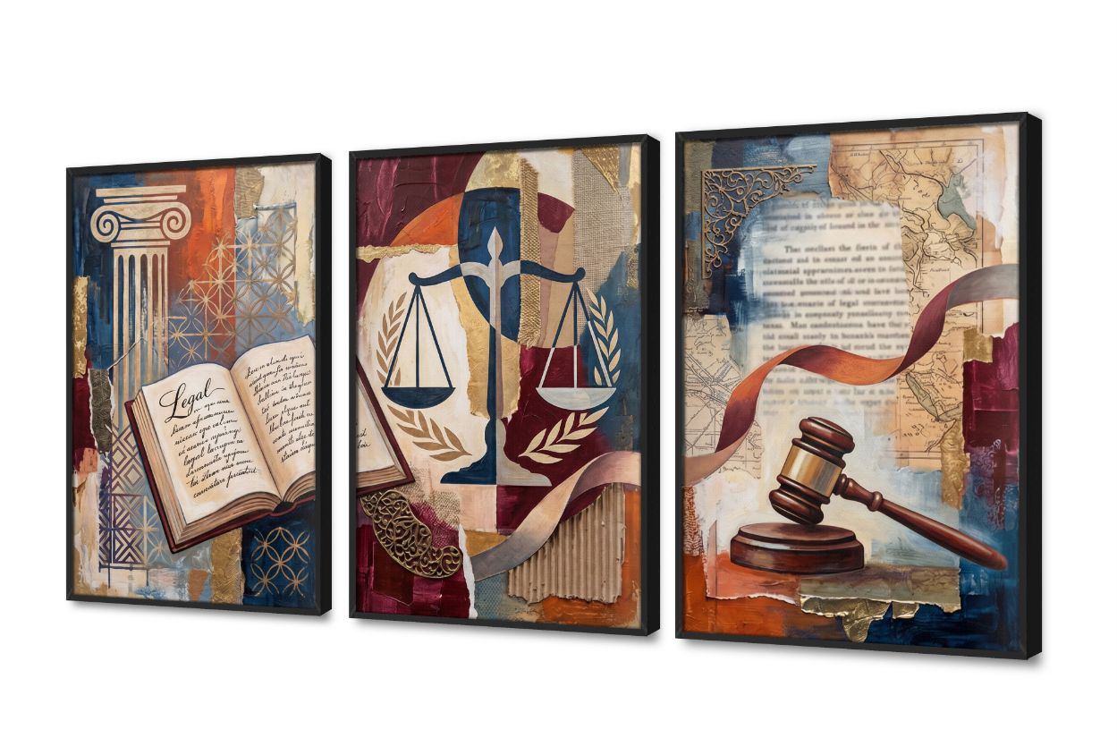 تتميز هذه المجموعة المكونة من ثلاث لوحات فنية باسلوب الكولاج الرقمي الذي يمزج بين الرموز القانونية الكلاسيكية مثل ميزان العدالة ومطرقة القاضي مع خلفيات تجريدية غنية بالالوان والانسجة الورقية والخرائط القديمة مما يضفي لمسة من الوقار والرقي الفني على المكاتب وشركات المحاماة بفضل دمج العناصر التاريخية مع التصميم العصري الجذاب والوان دافئة تبرز تفاصيل العمل, متوفر بمقاسات متعددة يمكنك اختيار او تغيير المقاس عند الطلب ,بتصميم مميز لـ تابلوهات مودرن, تابلوهات مودرن , لوحات فنية مودرن اعمال و شركات, قانون - قضاء - محاماه, English Text & Quotes, تجريدي , التابلوه يغلب عليه الالوان ابيض - اوف وايت, احمر - نبيتى, ازرق - تركواز, بنى - بيج, فضى – ذهبى , و مصمم بالشكل التالى 3 قطع, متعدد القطع ( اى عدد ) , بالعرض, ببرواز, برواز اسود, مستطيل , مناسب لديكور حوائط غرفة الاستقبال, مكاتب – شركات - اعمال , و هو يتميز بالسمات التالية : ديجيتال آرت, عتيق - فينتاج, كتابات و حروف, كلاسيك – نيو كلاسيك, لوحات فنية, مظهر بارز, مودرن , متوفر الان فى مصر و يأتى جاهز للتركيب مع دليل التركيب و اكسسوارات التركيب اللازمه