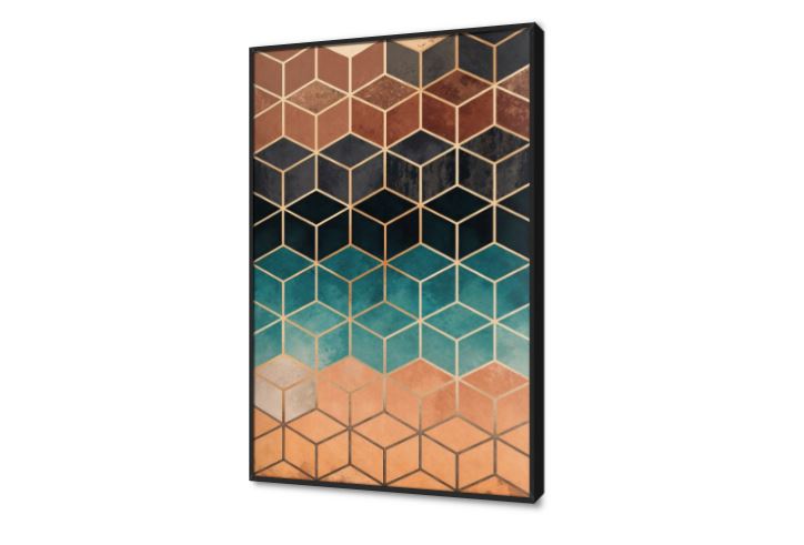 تابلوه مودرن يتميز بنمط هندسي متكرر من المكعبات ثلاثية الابعاد المحددة بخطوط ذهبية لامعة، موضوعة على خلفية ذات تدرج لوني انسيابي يمر عبر درجات البني الترابي والاسود العميق والأزرق المخضر والبرتقالي الهادئ، مما يخلق تصميما تجريديا معاصرا يجمع بين الدقة الهندسية والجمال اللوني ليضيف لمسة من العمق والرقي على ديكور منزلك., متوفر بمقاسات متعددة يمكنك اختيار او تغيير المقاس عند الطلب ,بتصميم مميز لـ تابلوهات مودرن, تابلوهات مودرن , لوحات فنية مودرن اشكال هندسية و زخارف , التابلوه يغلب عليه الالوان ازرق - تركواز, اسود, برتقالى, بنى - بيج, فضى – ذهبى, متعدد الالوان , و مصمم بالشكل التالى 1 قطعه , بالطول, ببرواز, برواز اسود, مستطيل , مناسب لديكور حوائط غرفة الاستقبال, غرفة المعيشة, مدخل المنزل, مكاتب – شركات - اعمال , و هو يتميز بالسمات التالية : اشكال هندسية و زخارف, الستريشن - فيكتور, تماثل - سيميترى, ديجيتال آرت, مودرن , متوفر الان فى مصر و يأتى جاهز للتركيب مع دليل التركيب و اكسسوارات التركيب اللازمه
