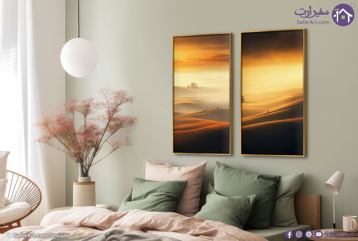 تتميز هذه المجموعة الفنية بتصميم يجسد سحر الطبيعة الهادئة من خلال تلال ذهبية مغطاة بالضباب في وقت الشروق بلمسة فنية تجريدية بسيطة تضفي جوا من السكينة والهدوء على المكان وتعتبر تابلوهات ديكور مثالية للمساحات الحديثة حيث تدمج بين دفء اللون البرتقالي وعمق الظلال السوداء في تكوين بصري متناغم يعزز من جمال التصميم الداخلي لمنزلك بأسلوب فني معاصر وراقي, متوفر بمقاسات متعددة يمكنك اختيار او تغيير المقاس عند الطلب ,بتصميم مميز لـ تابلوهات مودرن, تابلوهات مودرن , لوحات فنية مودرن جبال, مناظر طبيعية , التابلوه يغلب عليه الالوان اسود, برتقالى, بنى - بيج , و مصمم بالشكل التالى 2 قطعه, متعدد القطع ( اى عدد ) , بالطول, ببرواز, برواز ذهبى, مستطيل , مناسب لديكور حوائط غرفة الاستقبال, غرفة المعيشة, غرفة النوم, مدخل المنزل, مكاتب – شركات - اعمال , و هو يتميز بالسمات التالية : بسيط و هادئ, صور فوتوغرافية, مودرن , متوفر الان فى مصر و يأتى جاهز للتركيب مع دليل التركيب و اكسسوارات التركيب اللازمه