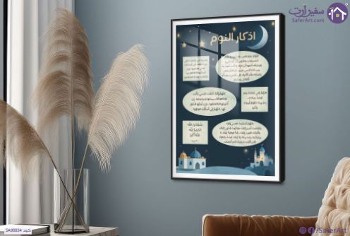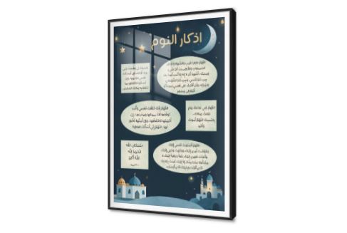 تابلوه اذكار النوم بتصميم هادئ، مشهدا ليليا هادئا يظهر فيه هلال مضيء في سماء داكنة، و تملأ أذكار النوم أجزاء مختلفة من التابلوه بخط عربي واضح وجميل، حيث يمزج التصميم بين العناصر الإسلامية التقليدية والأسلوب العصري البسيط، مستخدماً خلفية داكنة لتسليط الضوء على النصوص المضيئة، مما يخلق جواً من السكينة والروحانية., متوفر بمقاسات متعددة يمكنك اختيار او تغيير المقاس عند الطلب ,بتصميم مميز لـ تابلوهات مودرن, تابلوهات مودرن , لوحات فنية مودرن اذكار و ادعية, اسلامى - ايات قرآنية و خط عربى , التابلوه يغلب عليه الالوان ازرق - تركواز, الوان داكنة , و مصمم بالشكل التالى 1 قطعه , اكريليك, بالطول, ببرواز, برواز SF9, برواز اسود, مستطيل , مناسب لديكور حوائط غرفة اطفال, غرفة النوم, غرفة بنات, غرفة شباب , و هو يتميز بالسمات التالية : الستريشن - فيكتور, قابل للتعديل, كتابات و حروف, لوحات فنية, مودرن , متوفر الان فى مصر و يأتى جاهز للتركيب مع دليل التركيب و اكسسوارات التركيب اللازمه