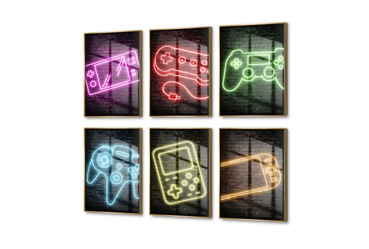 مجموعة تابلوهات مودرن مكونه من 6 قطع لاجهزه العاب الكترونيه و اذرع تحكم بالوان زاهيه و مميزة, متوفر بمقاسات متعددة يمكنك اختيار او تغيير المقاس عند الطلب ,بتصميم مميز لـ تابلوهات مودرن, تابلوهات مودرن , لوحات فنية مودرن جيمنج - العاب و تسليه , التابلوه يغلب عليه الالوان اسود, اخضر - زيتى, ازرق - تركواز, اصفر, الوان داكنة, برتقالى, بينك – فوشيا , و مصمم بالشكل التالى 6 قطع, متعدد القطع ( اى عدد ) , اكريليك, بالعرض, ببرواز, برواز ذهبى, مستطيل , مناسب لديكور حوائط غرفة شباب, مكاتب – شركات - اعمال , و هو يتميز بالسمات التالية : ديجيتال آرت, مودرن, نيون ستايل , متوفر الان فى مصر و يأتى جاهز للتركيب مع دليل التركيب و اكسسوارات التركيب اللازمه