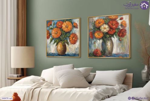 مجموعة تابلوهات ديكور مكونة من قطعتين تصور باقات من الزهور البرتقالية والبيضاء في فازات بتصميم فني يعتمد على اسلوب الرسم الانطباعي بضربات الفرشاة الواضحة والالوان الزاهية التي تبرز جمال الطبيعة الصامتة، حيث تتناغم الدرجات الدافئة للزهور مع الخلفية الباردة لخلق توازن بصري جذاب يضيف لمسة دافئة وحيوية لديكور منزلك ويجعلها قطعة فنية مميزة تخطف الانظار., متوفر بمقاسات متعددة يمكنك اختيار او تغيير المقاس عند الطلب ,بتصميم مميز لـ تابلوهات مودرن, تابلوهات مودرن , لوحات فنية مودرن طبيعه صامتة, فازات و اوانى, ورود - زهور - نباتات , التابلوه يغلب عليه الالوان احمر - نبيتى, اخضر - زيتى, برتقالى , و مصمم بالشكل التالى 2 قطعه, متعدد القطع ( اى عدد ) , بالعرض, ببرواز, برواز ذهبى, مربع, مستطيل , مناسب لديكور حوائط غرفة الاستقبال, غرفة المعيشة, غرفة النوم, مدخل المنزل, مكاتب – شركات - اعمال , و هو يتميز بالسمات التالية : الوان زيتية - اكريليك, لوحات فنية, مظهر بارز, مودرن , متوفر الان فى مصر و يأتى جاهز للتركيب مع دليل التركيب و اكسسوارات التركيب اللازمه