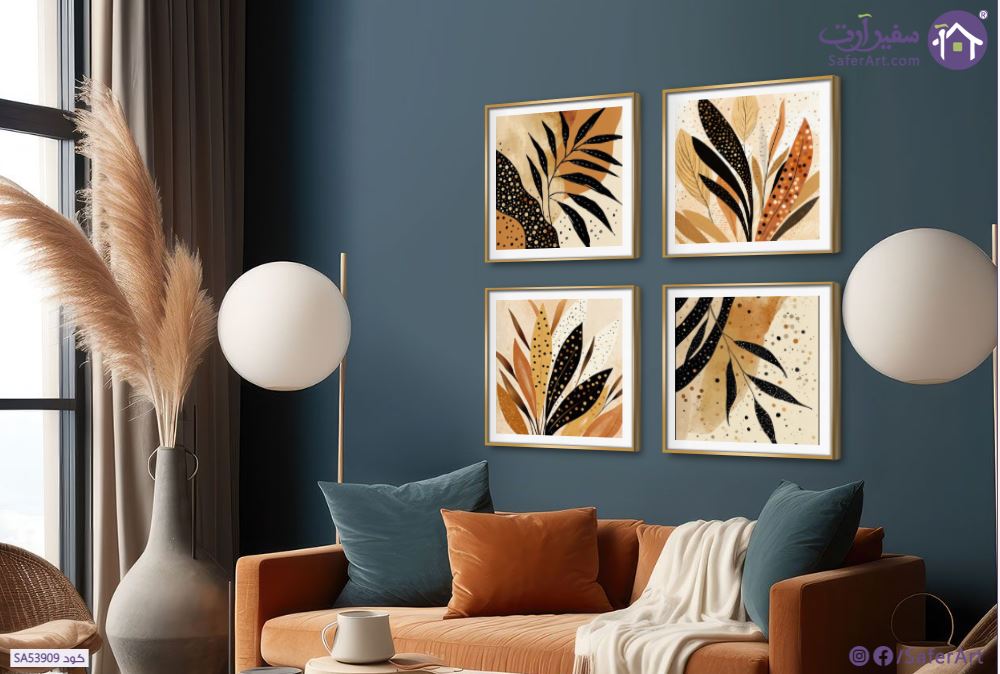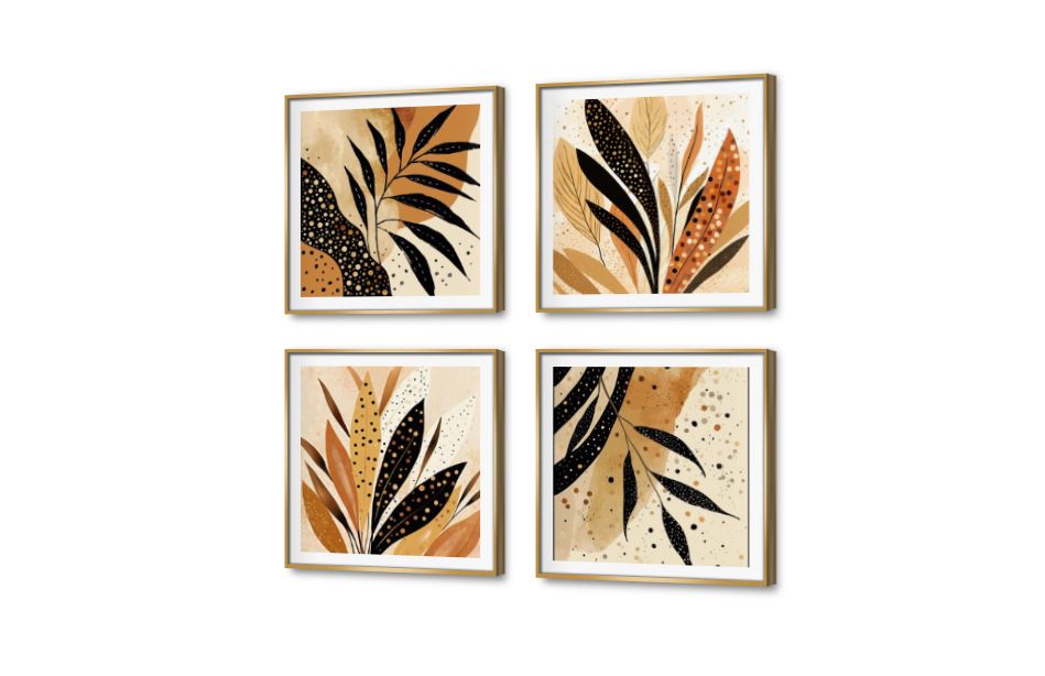 مجموعة لوحات ديكور مودرن، أوراق النخيل باللون الأسود على خلفية باللون البني ورتوش باللون الذهبي بتصمم بوهو مميز مكون من 4 قطع جاهزة للتعليق., متوفر بمقاسات متعددة يمكنك اختيار او تغيير المقاس عند الطلب ,بتصميم مميز لـ تابلوهات مودرن, تابلوهات مودرن , لوحات فنية مودرن اوراق شجر - نباتات, ورود - زهور - نباتات , التابلوه يغلب عليه الالوان بنى - بيج, اسود , و مصمم بالشكل التالى 4 قطع, متعدد القطع ( اى عدد ) , ببرواز, برواز SF9, برواز ذهبى, مربع , مناسب لديكور حوائط غرفة الاستقبال, غرفة المعيشة, مدخل المنزل , و هو يتميز بالسمات التالية : بوهو ستايل, ديجيتال آرت, مودرن , متوفر الان فى مصر و يأتى جاهز للتركيب مع دليل التركيب و اكسسوارات التركيب اللازمه